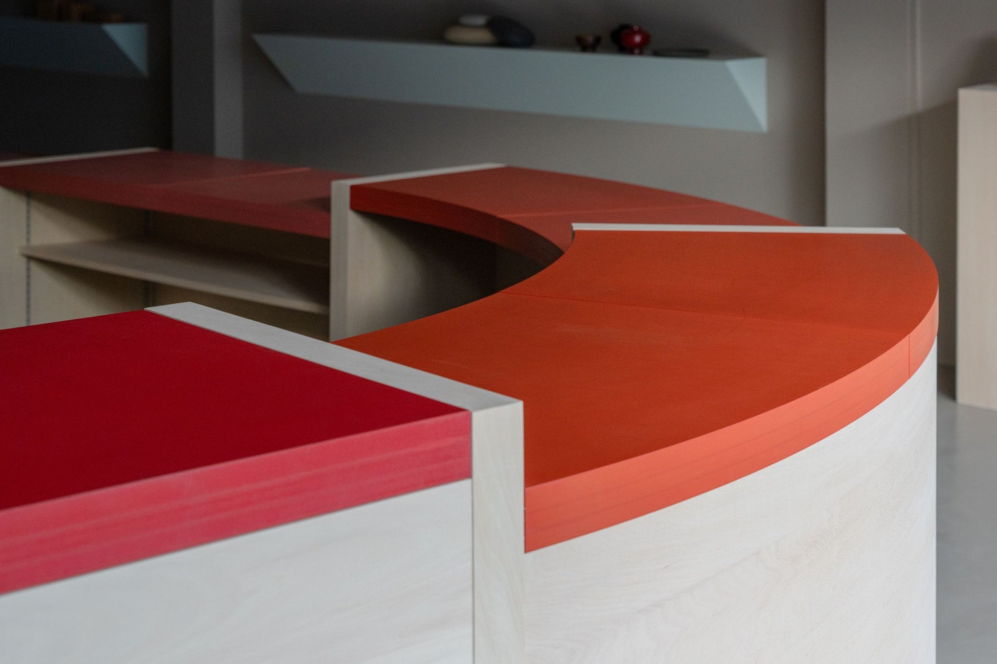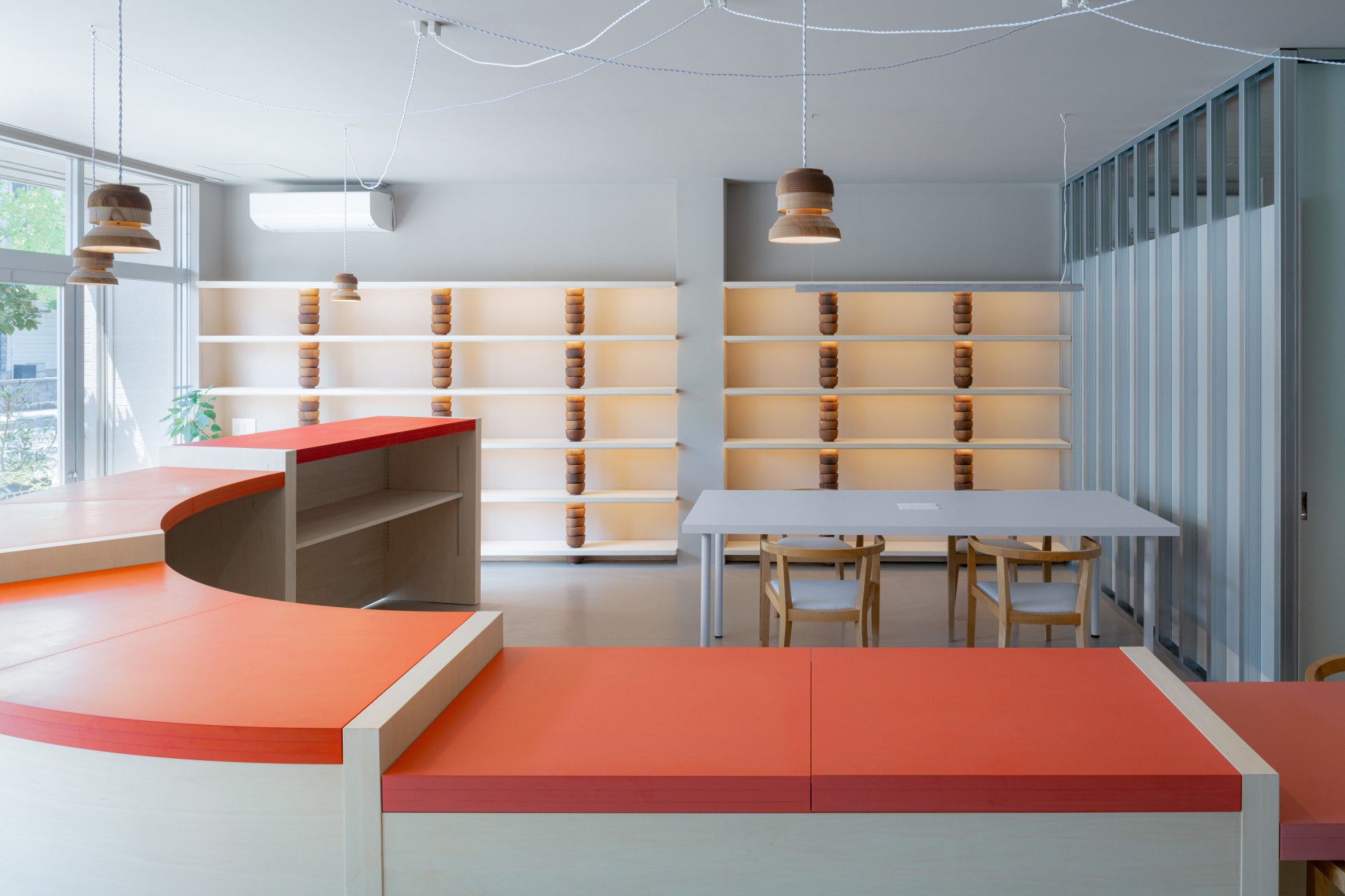 200年にわたり鯖江市河和田で越前漆器を作り続けてきた「漆琳堂」による漆塗りカウンター。約5mの大きなカウンターは、手前から伝統的な朱色で塗り、奥に向かって徐々に淡い色彩へと変化させることで、空間に奥行きをもたらしています。