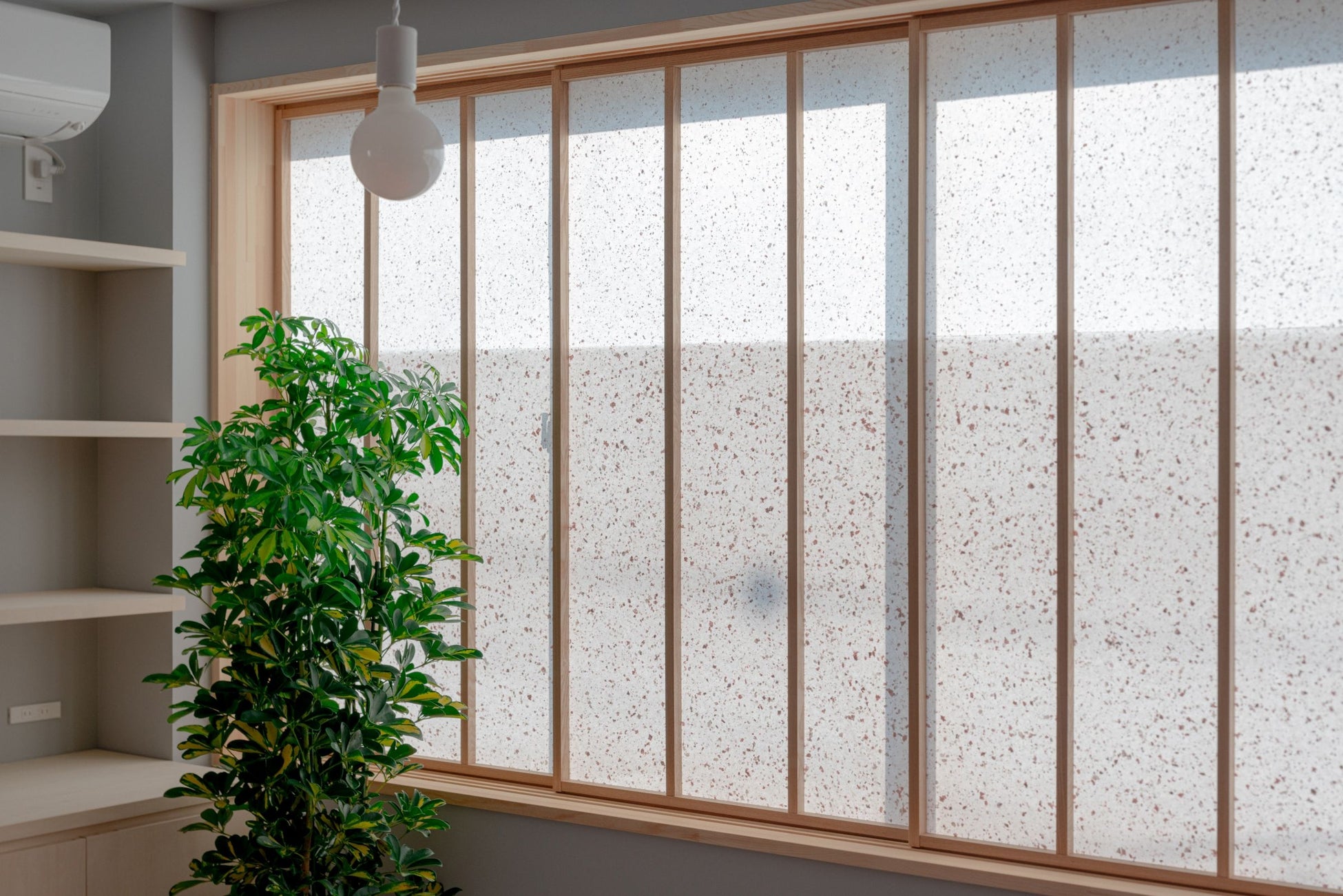 創業150年を迎えた越前市今立の「滝製紙所」が手がけた特製和紙を用い、「丸山表具店」が仕立てた障子。過去のRENEWイベントのチラシを漉き込み、紙の厚みに差をつけることで色彩の濃淡を表現。視覚的なメリハリをつけながらも、採光と遮光の両立を実現しています。