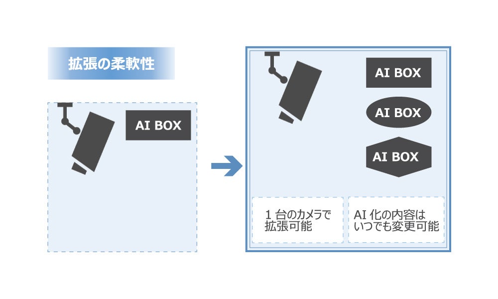 処理内容を決定して端末を「AI実装」する司令塔となるのは、手のひらサイズに入るほどの小さな「AI BOX」です。「AI BOX」から指示する「AI実装」の内容はいつでも変更や追加ができるため、当初想定していなかったデータ収集や、方針転換に対しても柔軟に対応することができます。