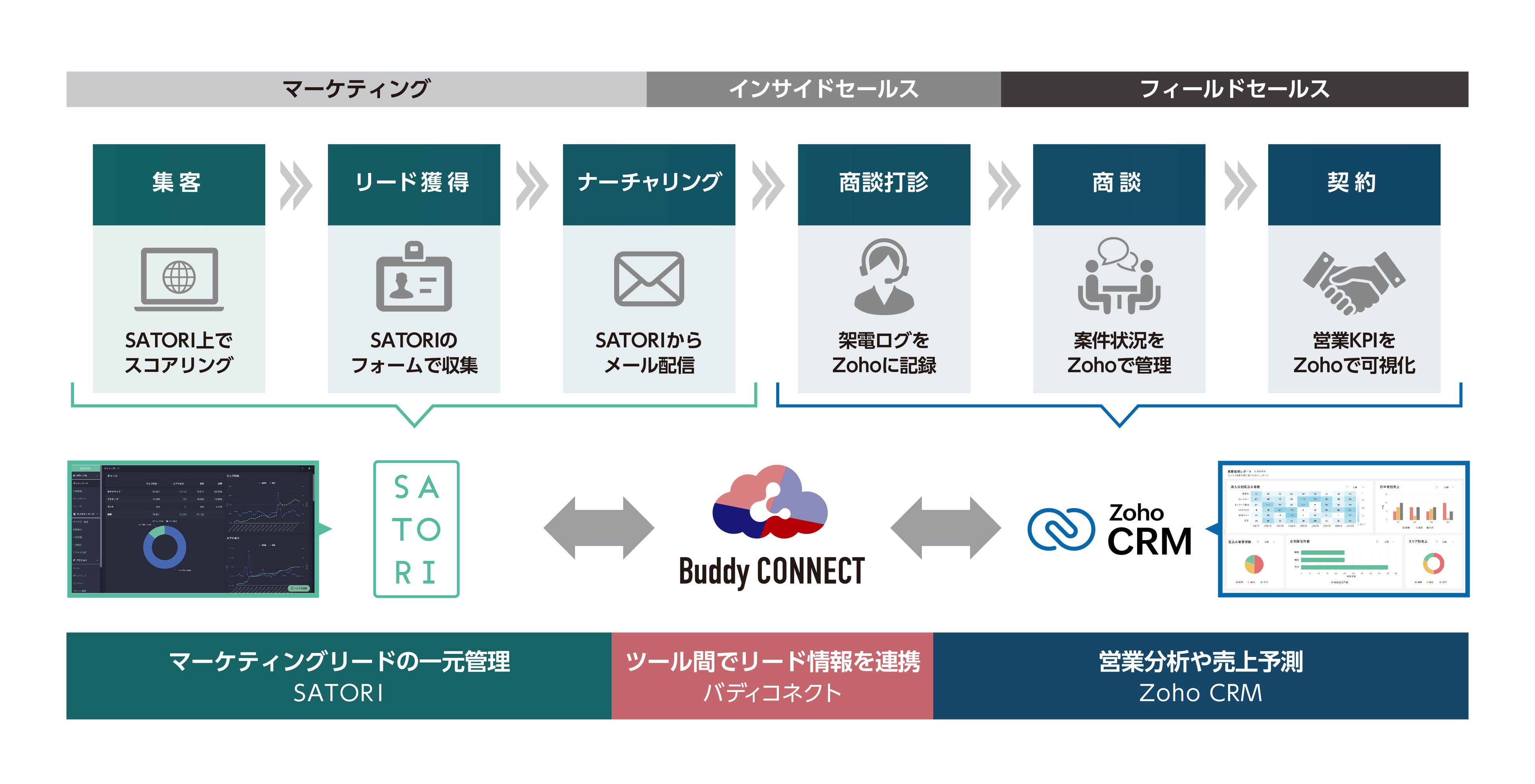 「SATORI」と「Zoho CRM」のリード情報を「バディコネクト」で連携することで、顧客の興味や関心に即したデジタルマーケティングを実現。