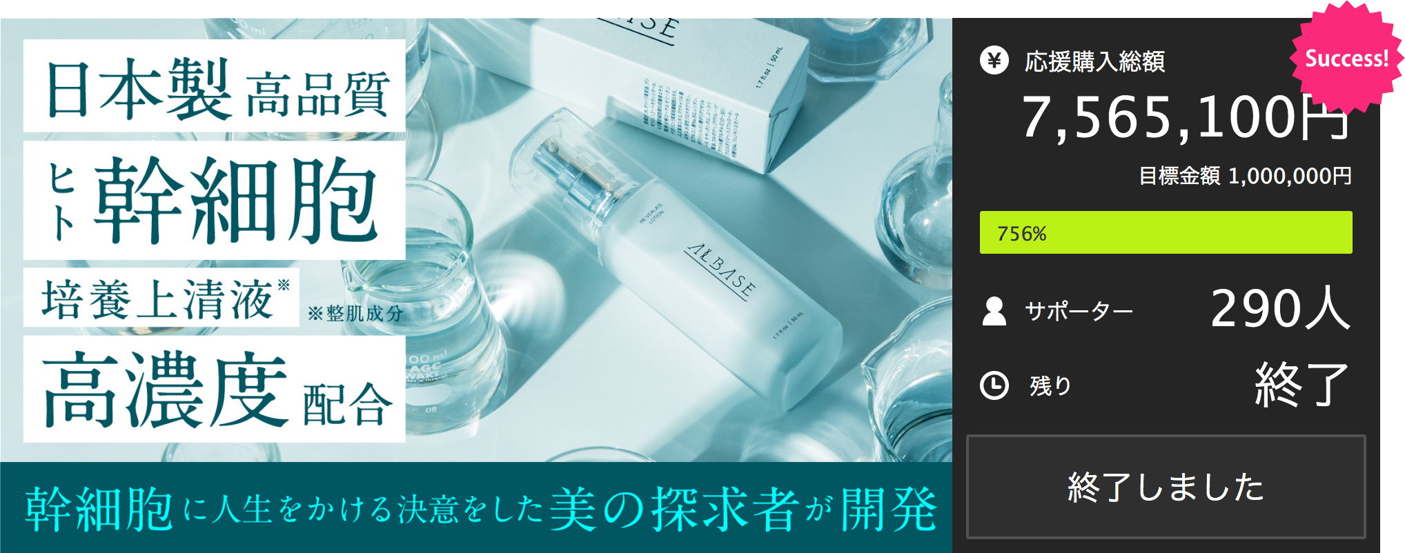 2021年末から開始した第一弾製品アルベイズ・リベレイトローションのクラウドファンディングは290名から目標を大きく超える合計で756万円以上の支援を受け大成功しました。