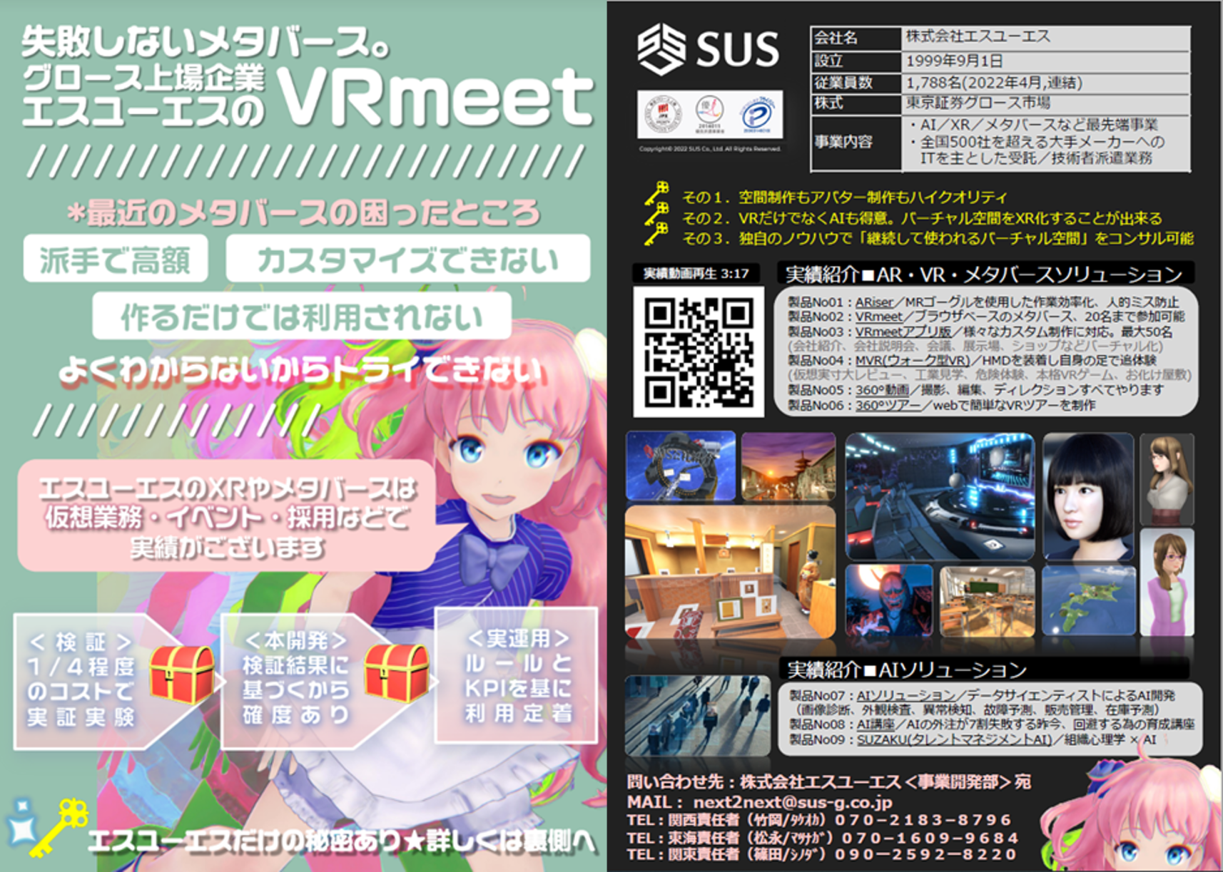 株式会社エスユーエス(京都市下京区、代表取締役:齋藤 公男)は、2022年10月26日 ~ 2022年10月28日に幕張メッセで開催されました「第2回XR総合展 秋」に出展いたしました。