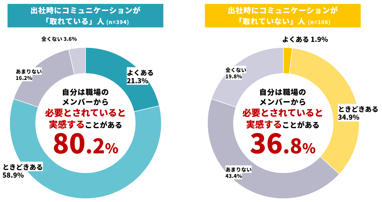 オフィス出社時にコミュニケーションが「取れていない」人のうち63%は、「職場で必要とされている実感を持てない」