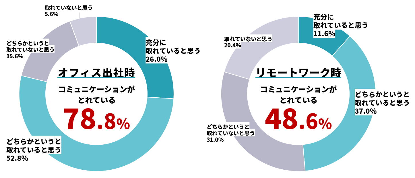 | 結果から、リモートワーク環境では「コミュニケーションが取れていない」と感じている人が半数以上いることがわかりました。それに対して、オフィスに出社してリアルで顔を合わせたときには「コミュニケーションが取れている」と回答した人が約8割。これからのオフィスには、これまで以上に「コミュニケーションの場」としての役割が求められてきそうですね。 |