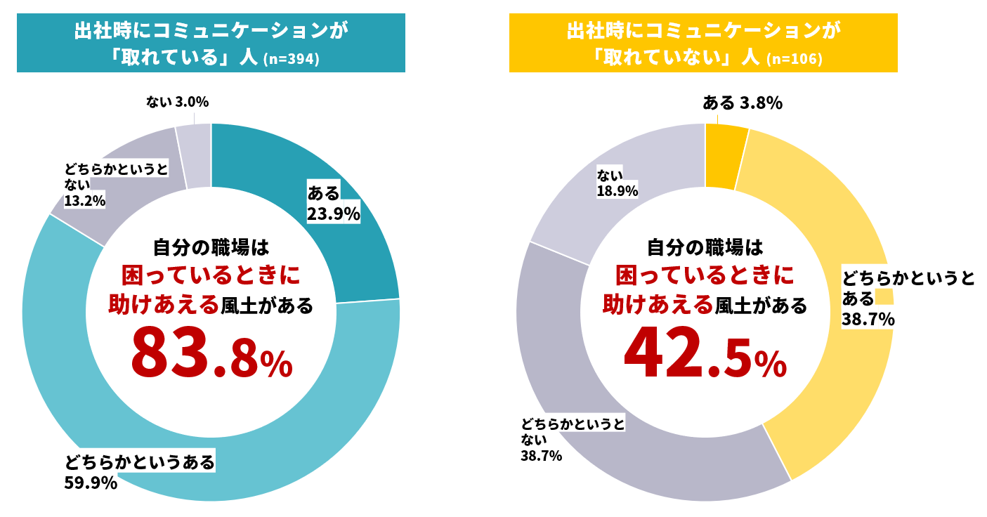 結果、オフィス出社時にコミュニケーションが「取れている」人のうち83.8%が、「自分の職場には困っているときに助け合える風土やチームワークがある」と回答。オフィス出社時にコミュニケーションが「取れていない」人では、42.5%に留まりました。