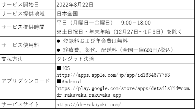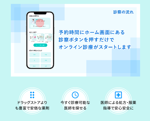 - 時間指定だけでなく、すぐに受診できる予約から診療・処方・服薬指導・配送手配が、全てオンライン上で完結するシームレスなサービスを提供