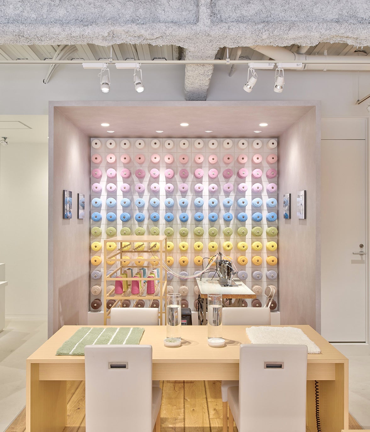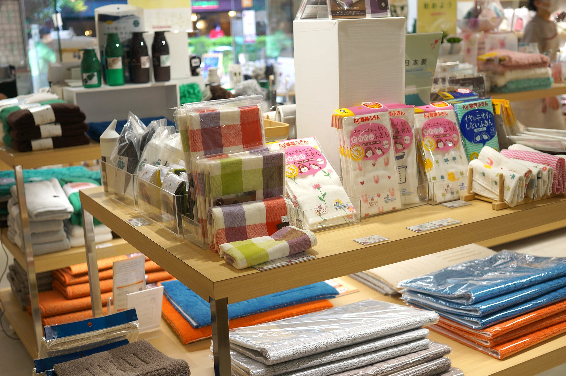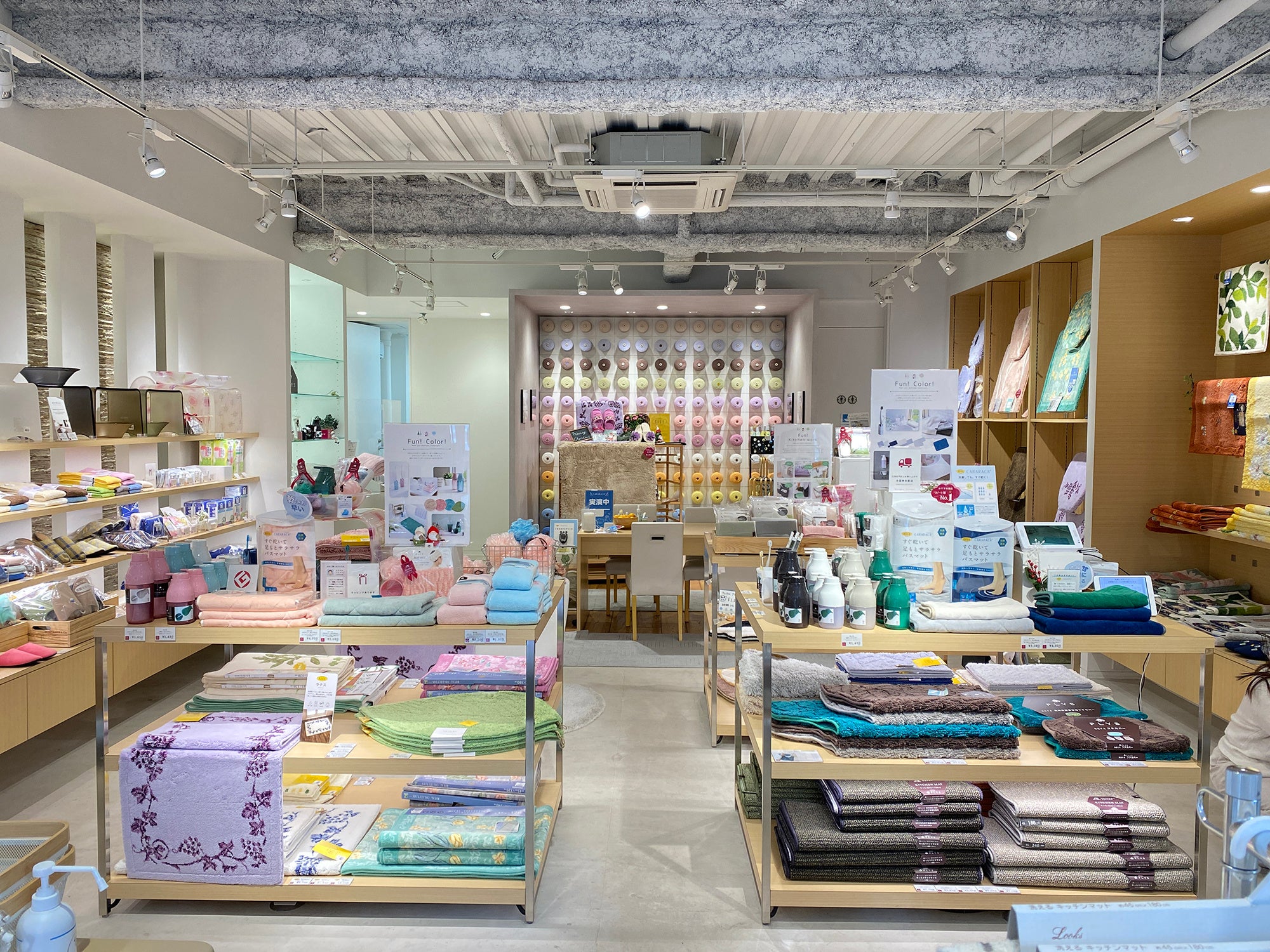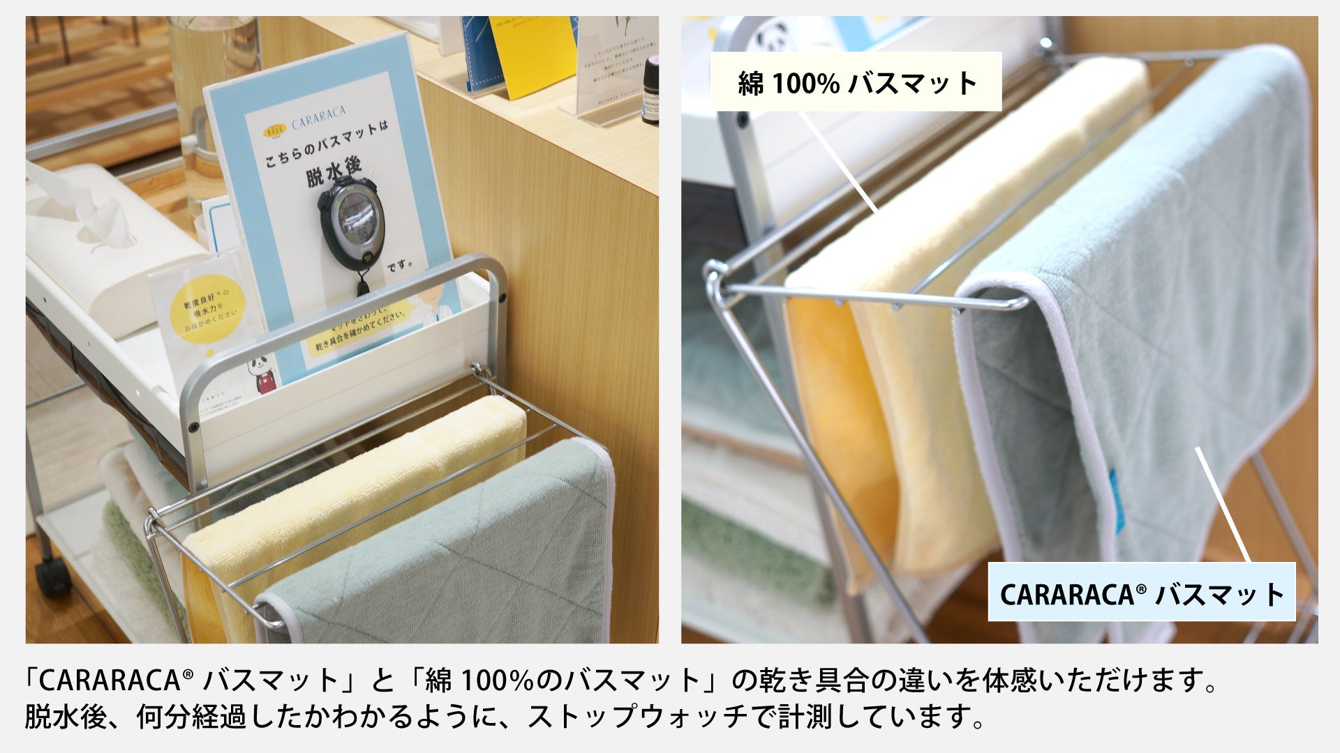 商品を触って実際に見て買うことができることがリアル店舗の魅力の1つ。マットを作り続けて50年以上、マットの柄の表現や、作りには自信があります。画面上では伝えきれない、質感やカラーのニュアンスを直に感じていただき、使い心地を確かめ、ご納得して選んでいただける、そんなお店にこだわりました。バスマットでは、洗濯後の乾きの速さを体感していただけるコーナーを設けています。