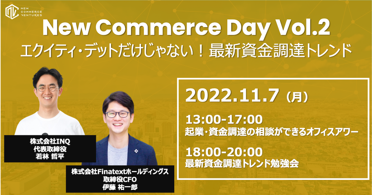 小売・流通のDXを支援するNew Commerce Ventures株式会社(本社:東京都品川区、代表取締役:松山馨太・大久保洸平、以下NCV)は、コマース領域のスタートアップや事業会社を対象とするイベント『New Commerce Day Vol.2 エクイティ・デットだけじゃない!最新資金調達トレンド』を開催します。