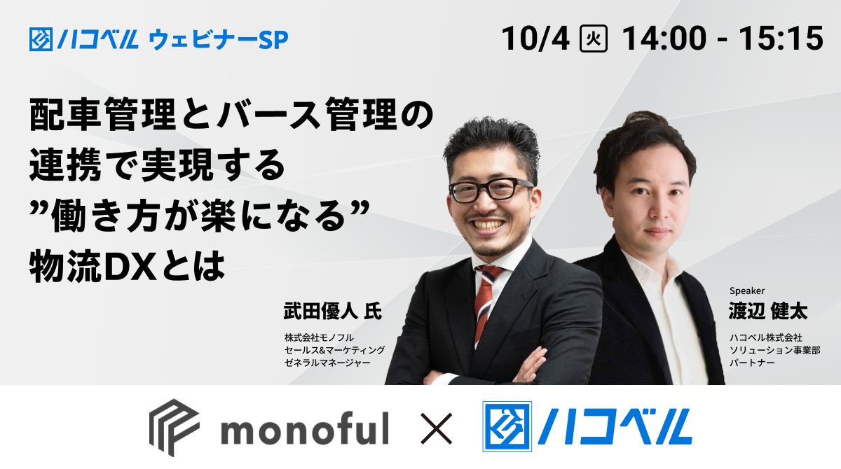 【10月4日(木)ハコベルウェビナー開催】<ハコベル×モノフル共催>配車管理とバース管理の連携で実現する ”働き方が楽になる”物流DXとは