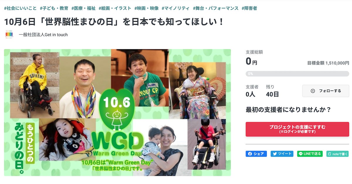 一般社団法人Get in touch(代表:東ちづる、以下、Get in touch)は、世界各国で10月6日に展開される「世界脳性まひ(*1)の日」を機会に、この日を「Warm Green Day (WGD)」(ウォーム・グリーン・デー/あたたかなみどりの日)と名付け、誰も排除しない「まぜこぜの社会」を目指して活動いたします。