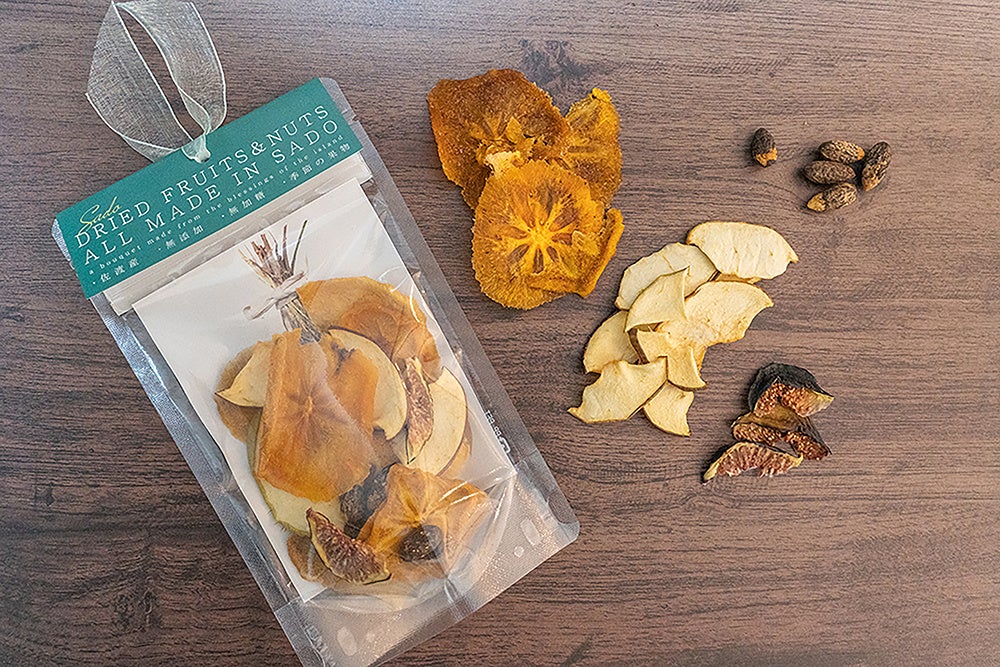 原材料は全て佐渡産、加工からパッケージングまで全て佐渡島で完結しています。フルーツアイランドと言っても過言ではない程、たくさんの果物がとれる佐渡島。そんな佐渡島の果物を旬な時に収穫し、ひとつひとつ手作業でドライフルーツに加工しています。