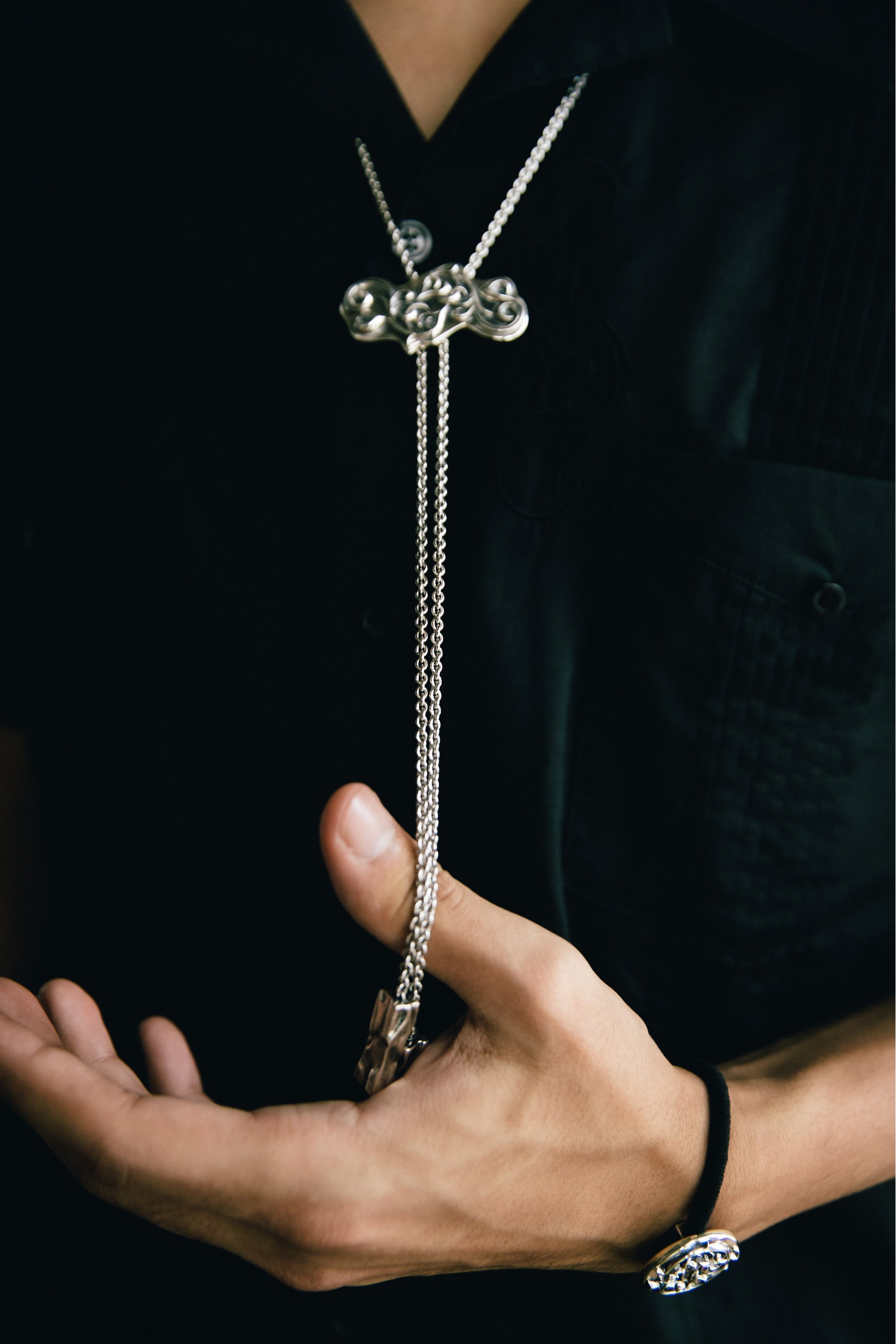 A Manとは、シルバー925を用いたループタイとコンチョヘアゴムを制作。 ループタイにおいてはループの部分までシルバーで制作している。