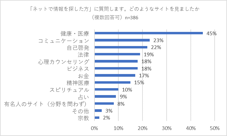 また、「ネットで情報を探す」と回答した方に、「どのようなサイトを見ましたか」(複数回答可)との問いには「健康・医療」が45パーセントで最多。以下の「コミュニケ―ション」(23パーセント)、「自己啓発」(22パーセント)に20パーセント以上の大きな差がつきました。