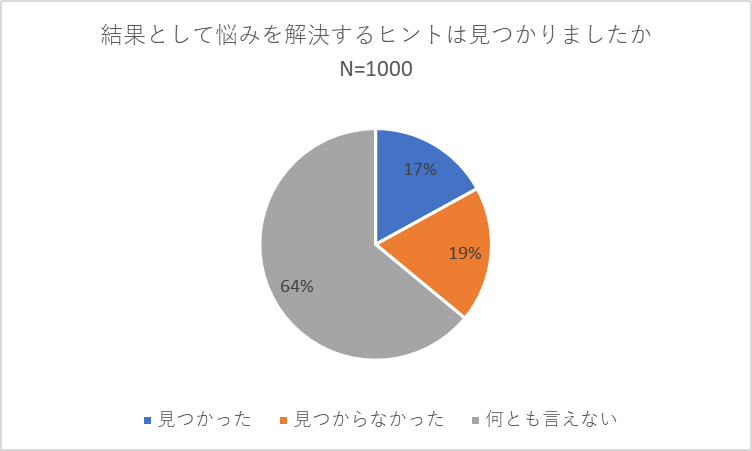 最後に「結果として悩みを解決するヒントは見つかりましたか」との質問には、「何とも言えない」が64パーセントで最多でした。「見つかった」(17パーセント)と「見つからなかった」(19パーセント)がともに20パーセント弱という結果となりました。