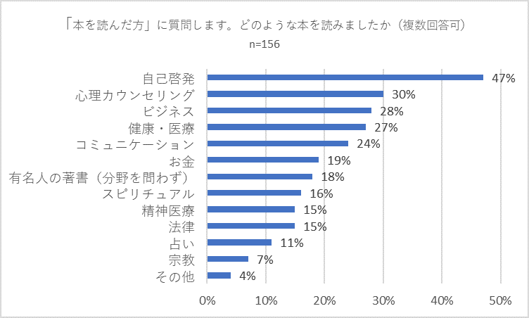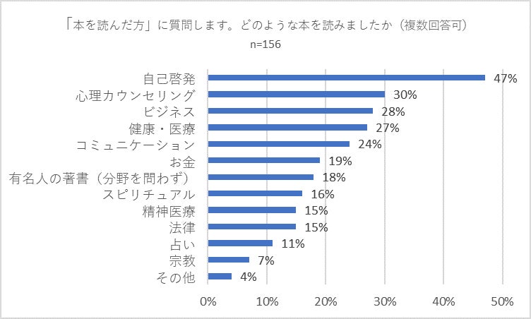 「本を読む」と回答した方に行った「どのような本を読みましたか」(複数回答可)との質問には「自己啓発」が47パーセントでトップとなり、以下「心理カウンセリング」(30パーセント)、「ビジネス」(28パーセント)、「健康・医療」(27パーセント)が続きました。ここでもトップと2位以下に大きな差がつきました。