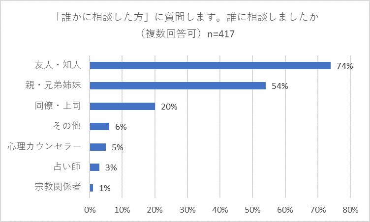 次に「誰かに相談する」と回答した方に「誰に相談しましたか」(複数回答可)と質問したところ、「友人・知人」が74パーセントとなり、次に多かった「親・兄弟姉妹」(54パーセント)に20パーセントの大差つけてトップとなりました。3位は「同僚・上司」の20パーセントでした。