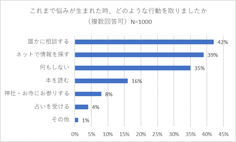 まず初めに「これまで悩みが生まれた時、どのような行動を取りましたか」(複数回答可)との質問を行ったところ、「誰かに相談する」が42パーセントでトップとなりました。次に多かったのが「ネットで情報を探す」(39パーセント)。さらに、「何もしない」(35パーセント)、「本を読む」(16パーセント)が続きました。