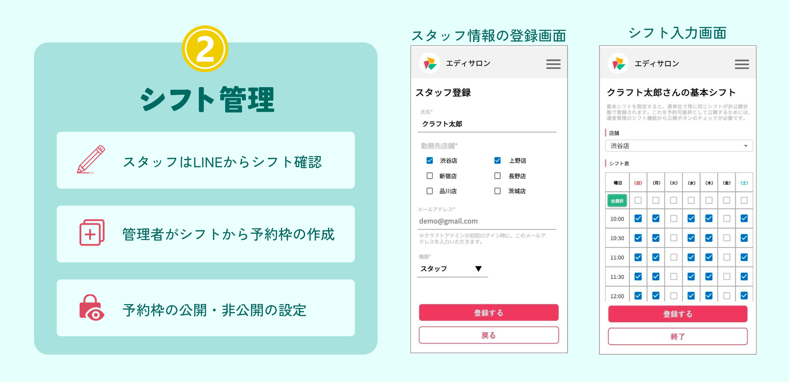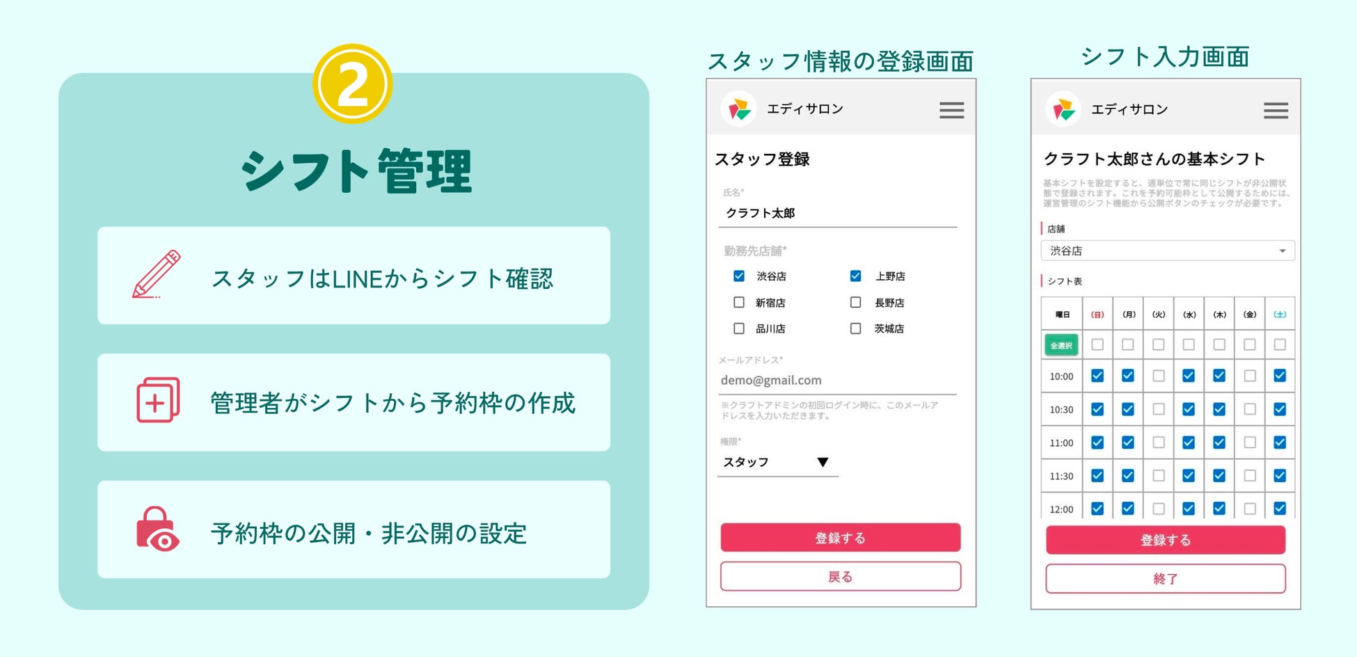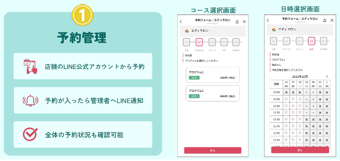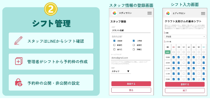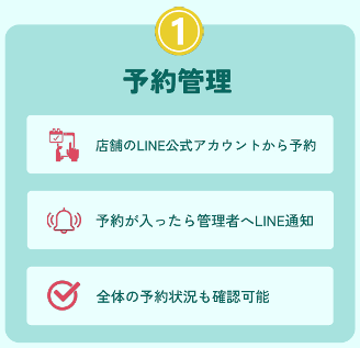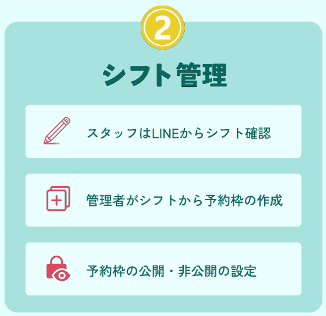 ③ ユーザー画面だけではなく事業者側の管理画面もLINEからアクセス可能にすることで、スマートフォン一本で日々の予約確認、シフト調整等の運用が可能。