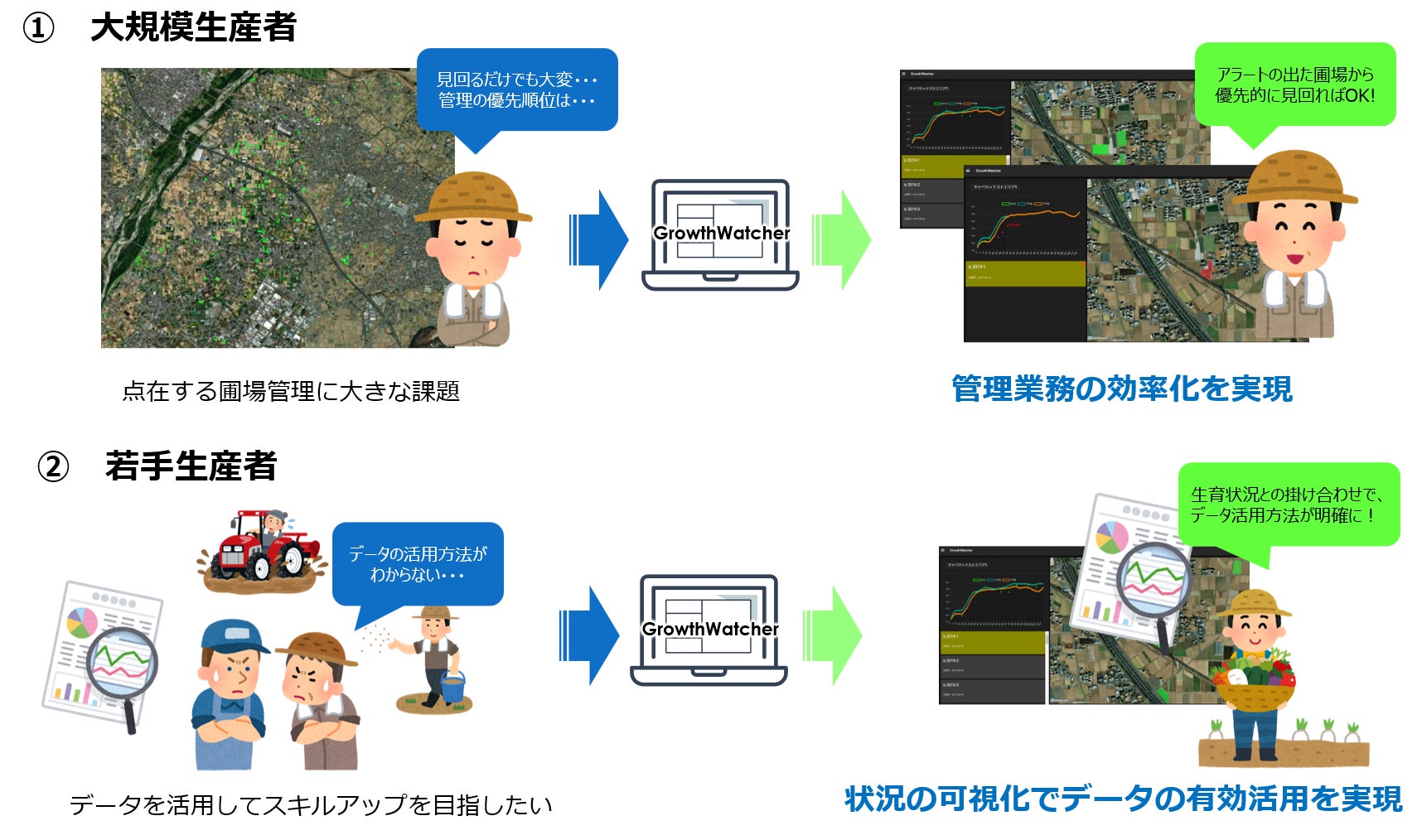 また、「GrowthWatcher」では作物の生育状況を定量的に数値化してお伝えするため、データ活用型の農業を展開したい、今後試してみたい、と考える生産者の皆さんにもお役立ち出来ます。