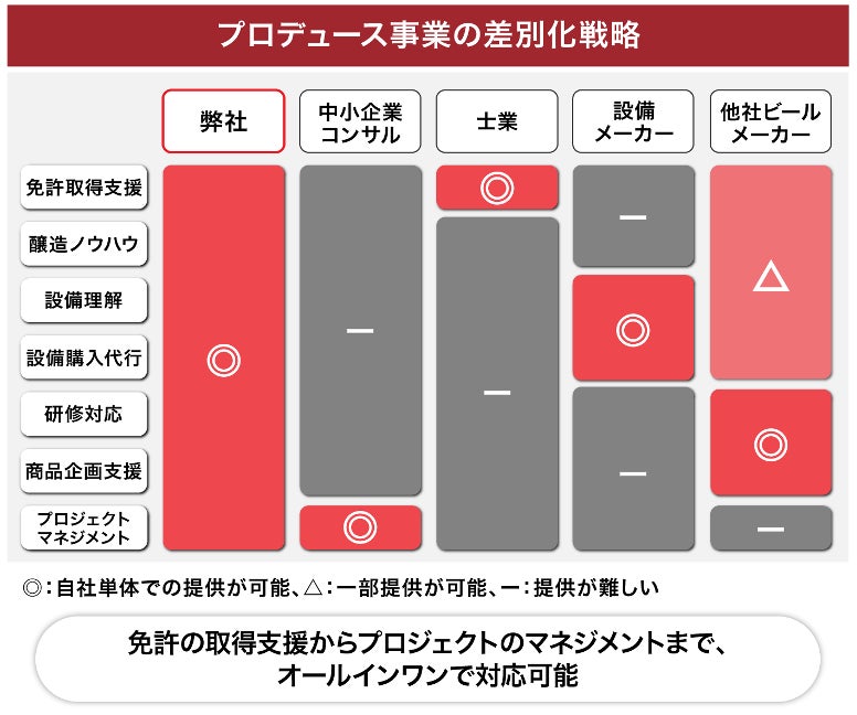 また、マイクロブルワリーのプロデュースにおいて、設備の手配や醸造技術の指導、免許取得、商品開発までをオールインワンでサポートするのも、弊社の特徴であるとともに強みのひとつであり、「設備の設置のみ」「商品企画のみ」を支援することは他社でもできますが、全てを一貫して行えるのは弊社のみだと自負しています。