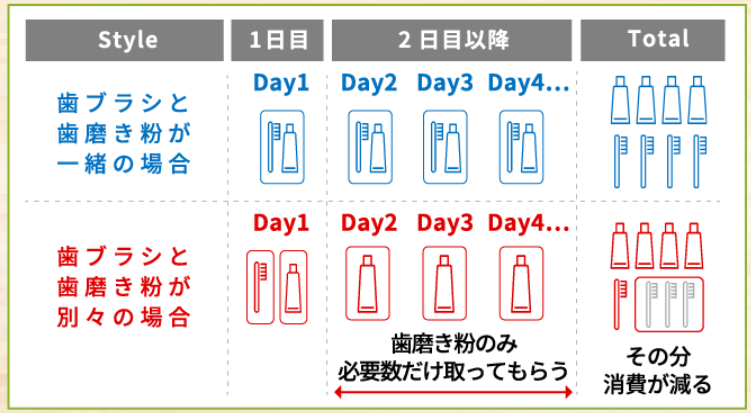 従来当たり前であった、「歯ブラシ+歯磨き粉チューブのセット」は、連泊時の客室清掃の際、まだ使える歯ブラシを廃棄しなければならない等、環境負荷がかかる。この点に、有馬温泉旅館協同組合としては、課題意識があった。