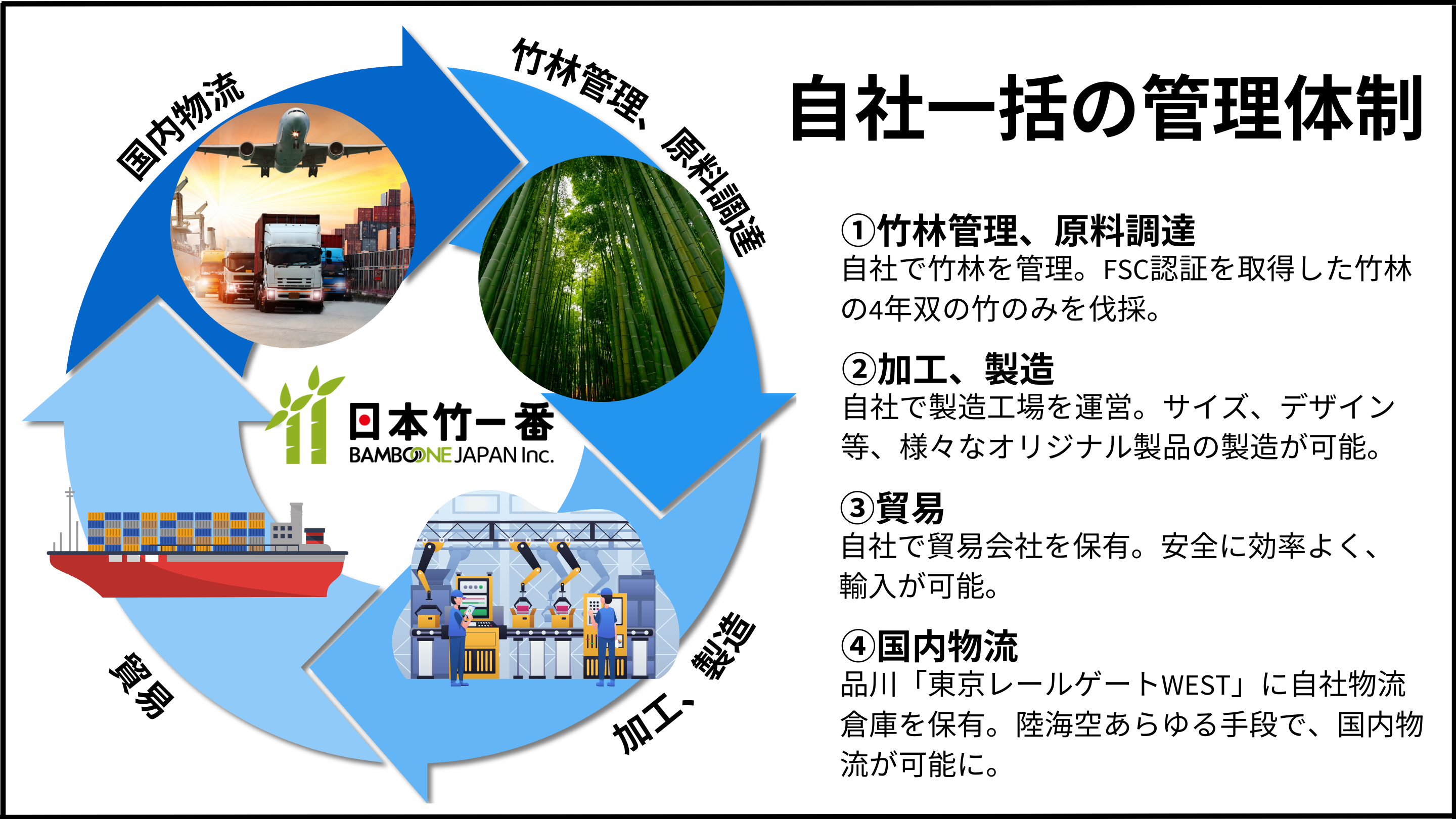 理由は、当社は問屋や商社ではなく、竹の専門メーカーであること。すなわち、原料調達、加工製造、貿易、国内物流までを自社一括で管理している為、すべての工程において、高い品質基準を持ちながら、不要なサプライチェーンを挟まず、ローコストでの製造・販売が可能となっている。