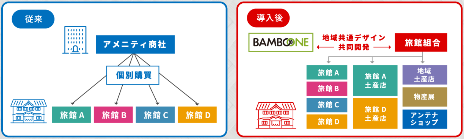 これは、旅館単独の仕入れではどうしても割高となってしまう消耗品を、組合組織が中心となって共同購買を行う事で、大量の商品を一度にまとめて仕入れることができ、仕入れコストを削減できるからだ。また、どの旅館に行っても統一感のあるデザインが置かれている事で、地域の一体感を創出、宿泊客へのブランディングも期待できる。