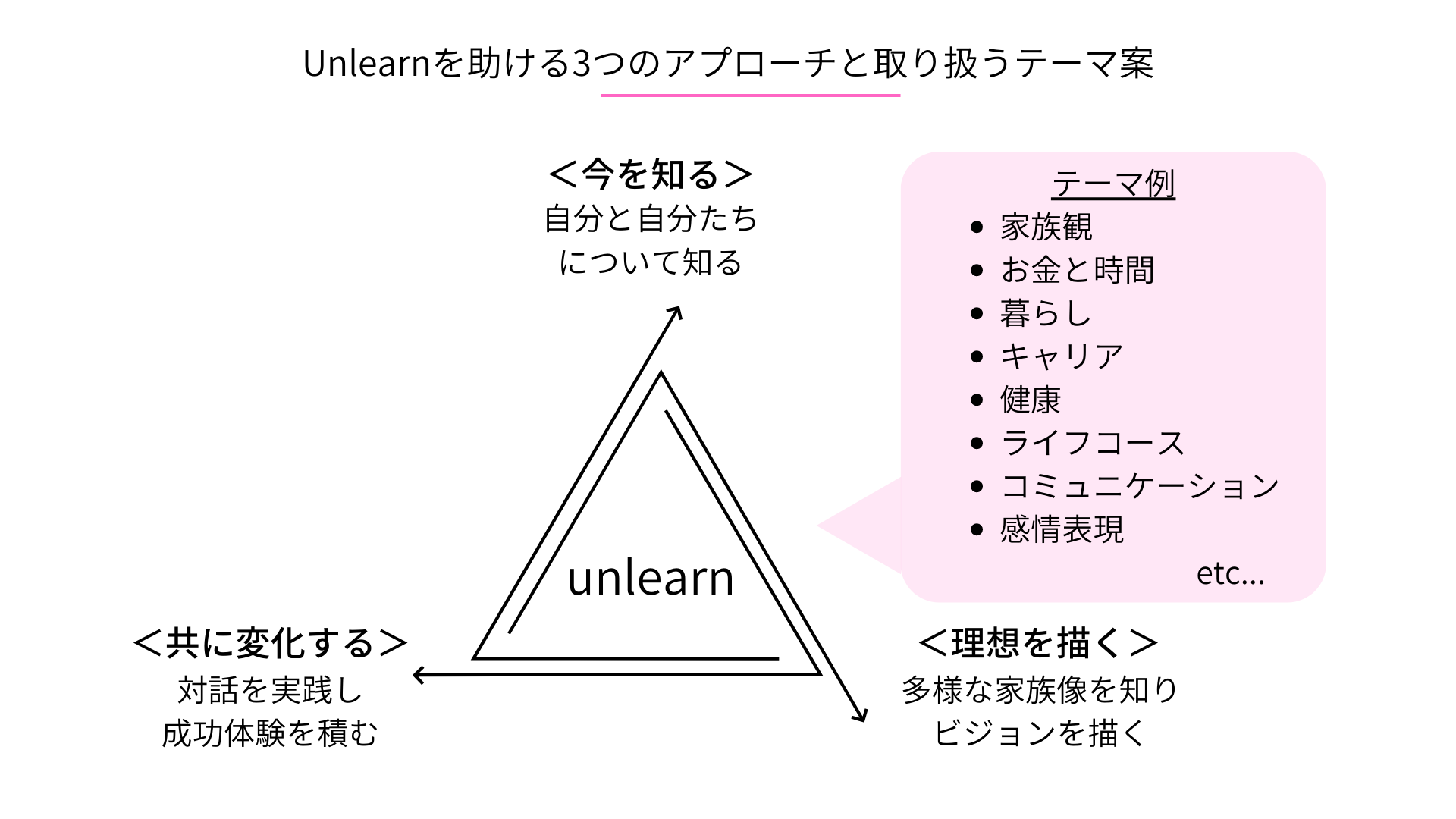 このような方々に、自分と相手の持つ家族観を知り、一度手放し、多様な家族に触れ、その上で自分たちらしい家族像を描く、そんな”学びほぐし(アンラーニング)”のプログラムをとおして、この先の夫婦・家族の困難を乗り越えていける自信を持てるだろうと信じています。