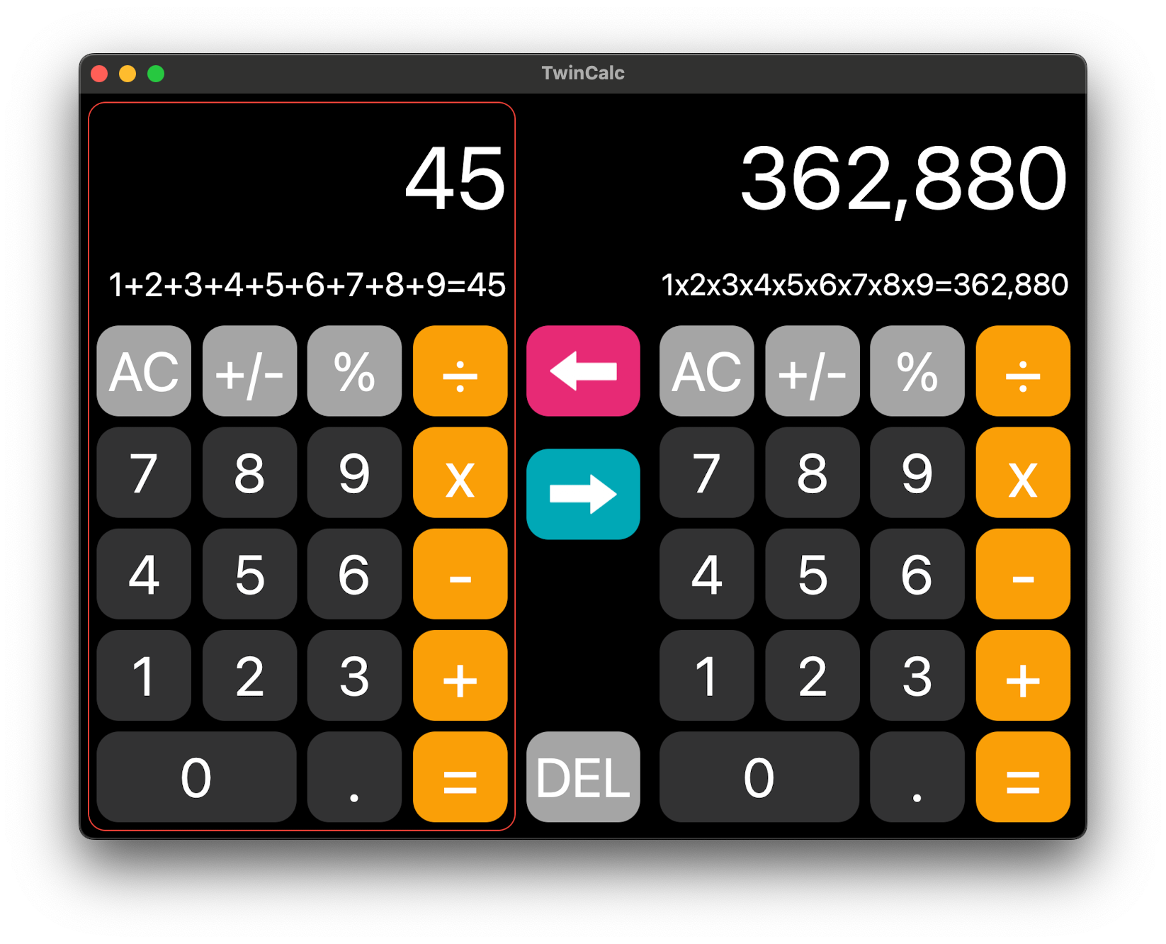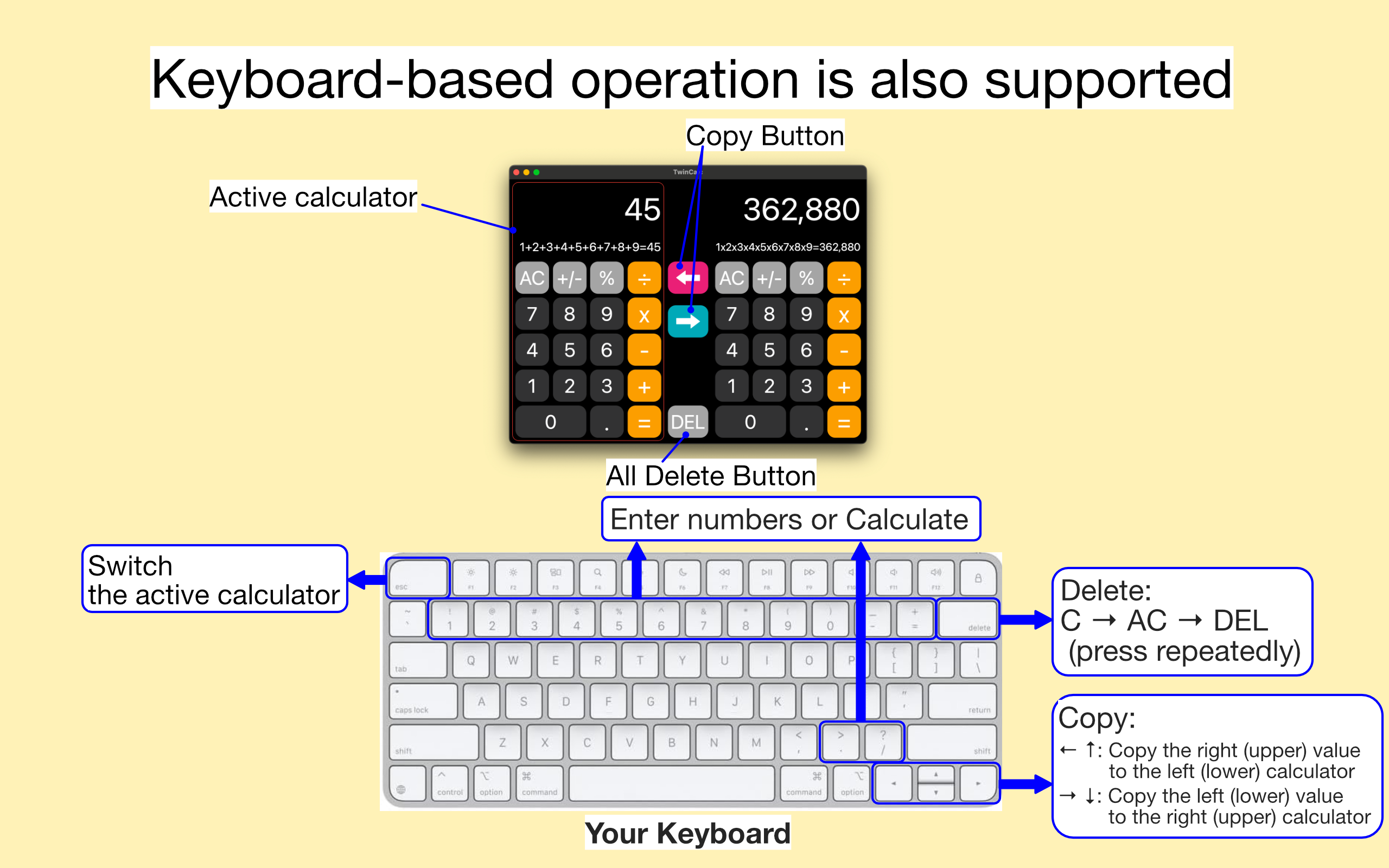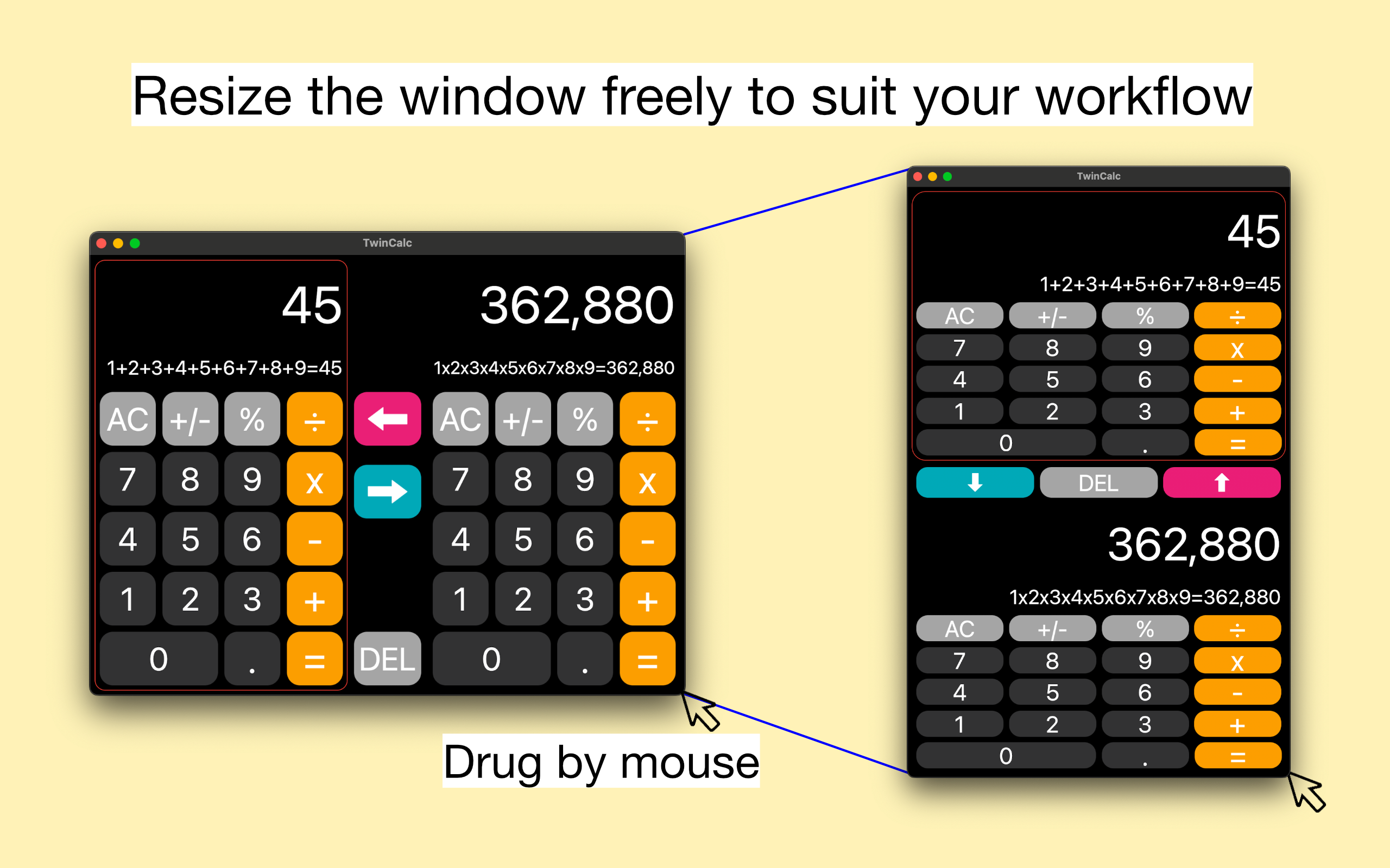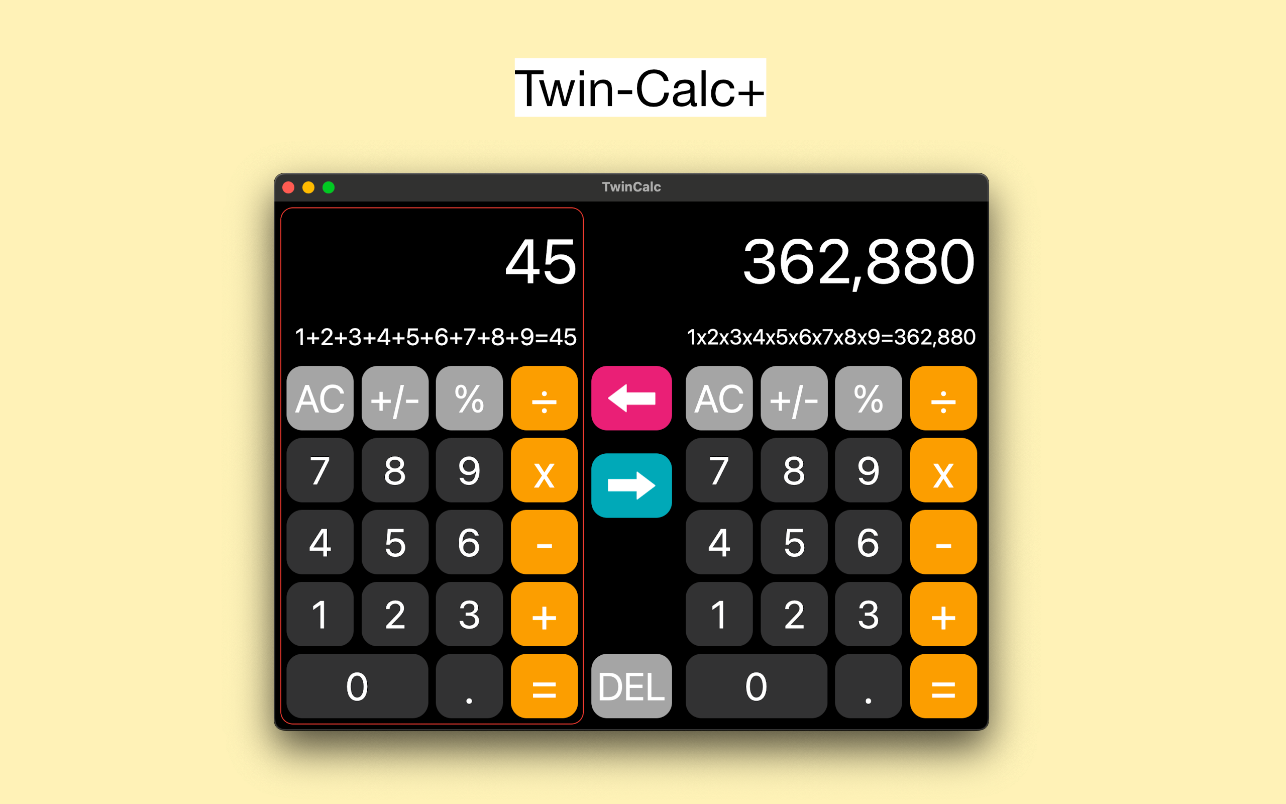 本アプリは、Mac専用アプリとして新規にリリースされたもので、iPhone / iPad向けの「TwinCalc」とは別アプリとなります。