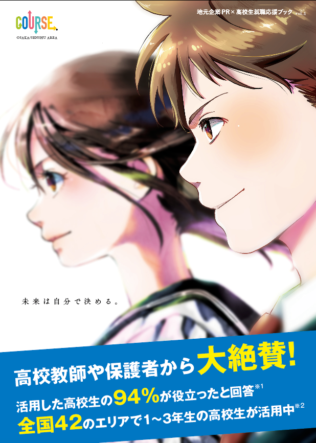 高校生の就職活動はとても短期間で、就職を志望するほとんどの高校生は、企業の魅力を知らないまま、文字だけの求人票を見て就職活動をおこなっています。そんな高校生に、もっと企業を知り、選択肢を広げ、安心感をもって就職して欲しいという想いから、高校生就職応援BOOK「COURSE(コース)」をつくりました。