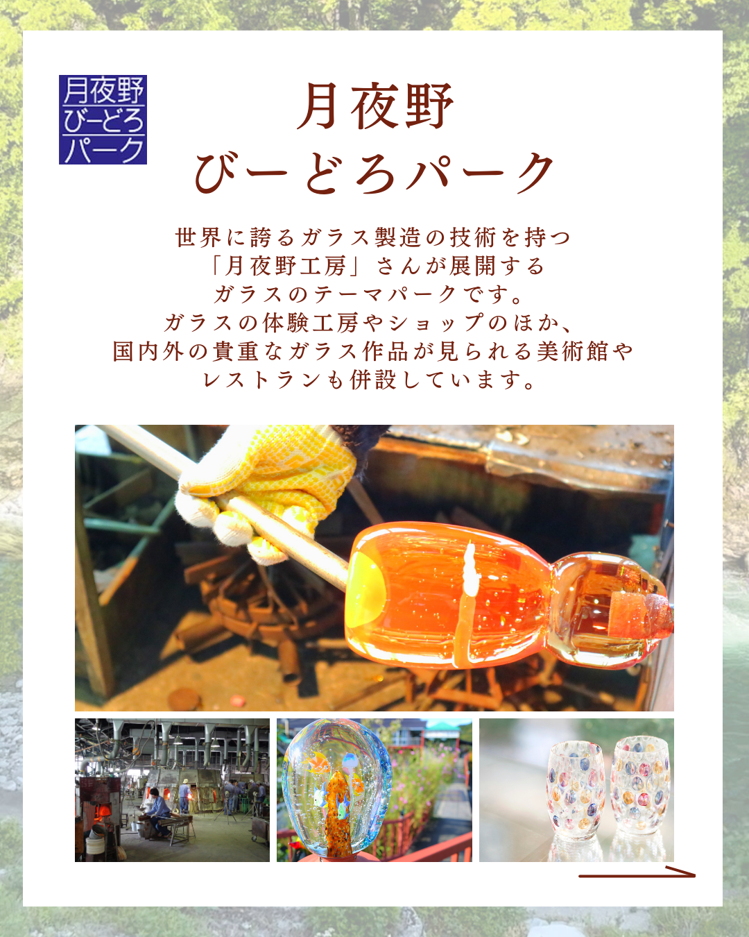 群馬県みなかみ町にある、世界に誇るガラス製造の技術と歴史を持つ「月夜野工房」が展開する“ガラスのテーマパーク” ガラスの体験工房やショップのほか、国内外の貴重なガラス作品が見られる美術館やレストランも併設しています。