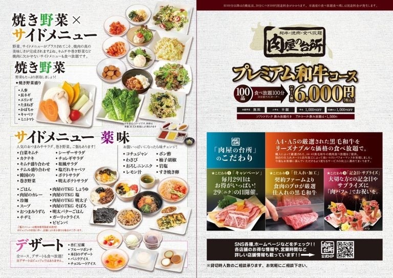 株式会社 ⾁屋の台所(本社 東京都千代⽥区、代表取締役 ⽵本 慎輔)は、⿊⽑和⽜焼⾁⾷べ放題「⾁屋の台所」対象店