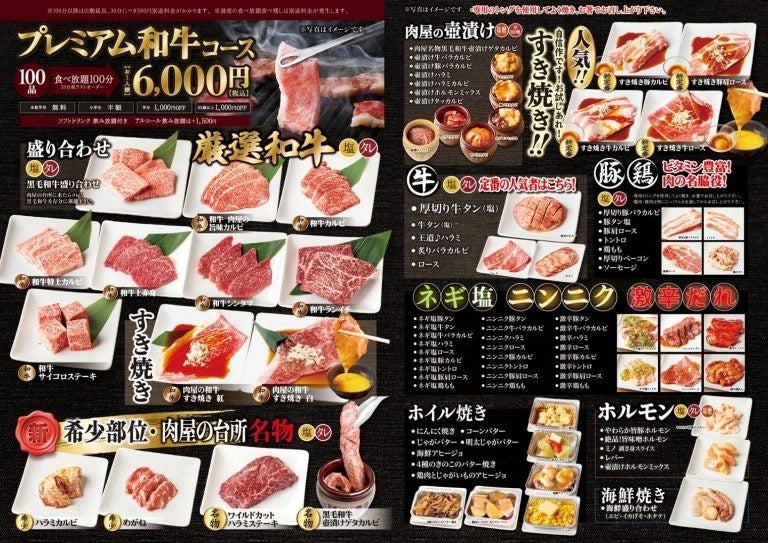 全100品以上⾷べ放題の「プレミアム和⽜コース」100min/6,000円(税込)を、⾁の⽇(10⽉29⽇)限定で、