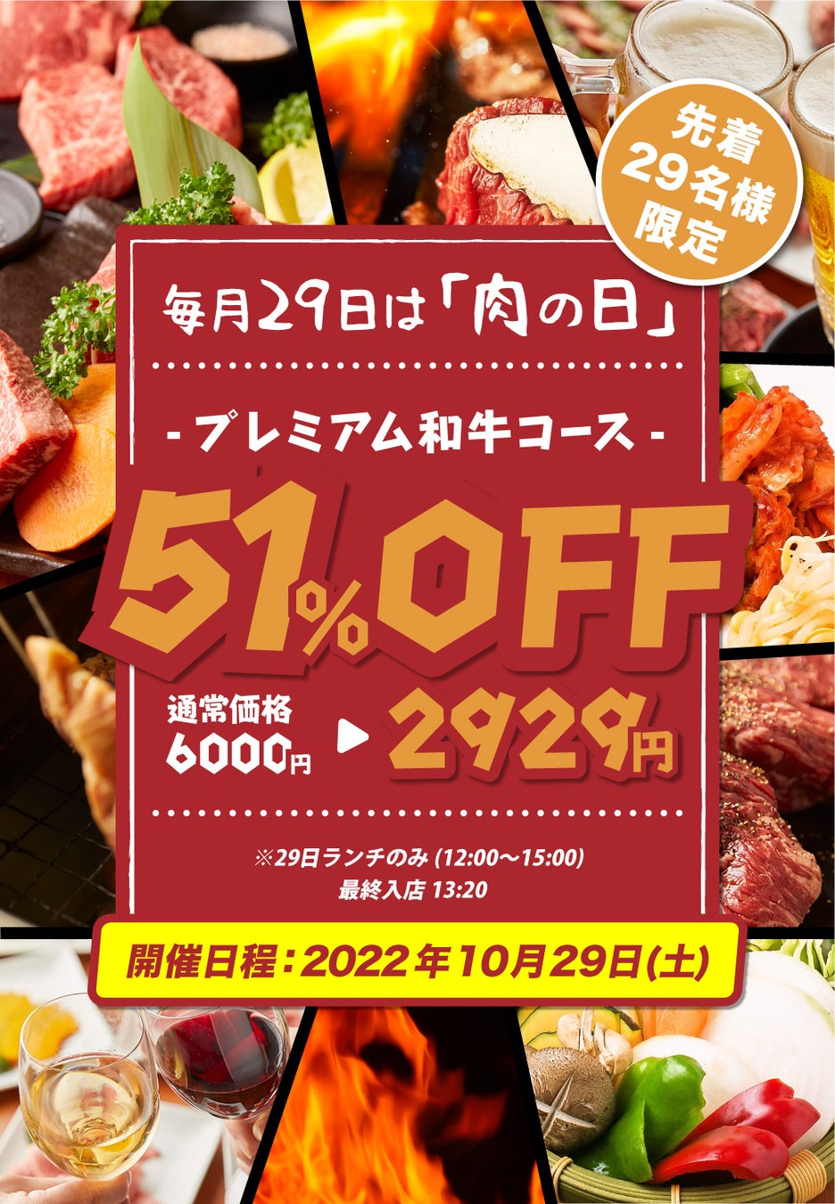 【毎月29日(肉の日)限定‼】プレミアム和牛コースが半額以下⇒2,929円(税込)‼