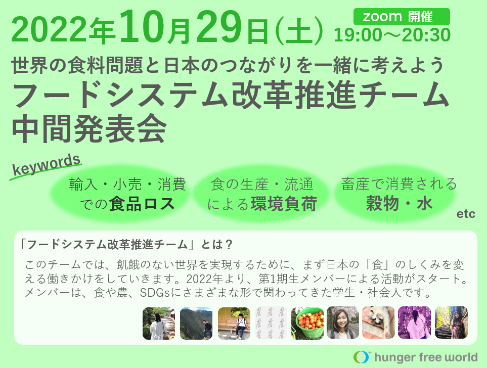 国際協力NGO ハンガー・フリー・ワールド(本部:東京都千代田区飯田橋4-8-13 山商ビル8階、理事長 原田麻里子)の学生・社会人ボランティアから成る「フードシステム改革推進チーム」が、2022年10月29日にイベント「~世界の食料問題と日本のつながりを一緒に考えよう~ フードシステム改革推進チーム中間発表会」を開催。参加者を募集しています。