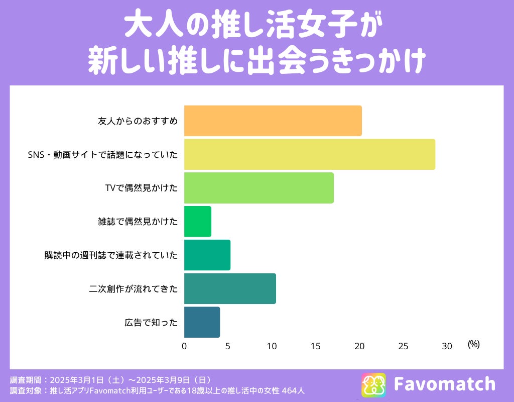 担降り・オタ卒の原因として一番多かった「他の推しの出現」ですが、そんな新しい推しと出会うきっかけとして最も多かったのは「SNS・動画サイトで話題になっていた(28.7%)」でした。