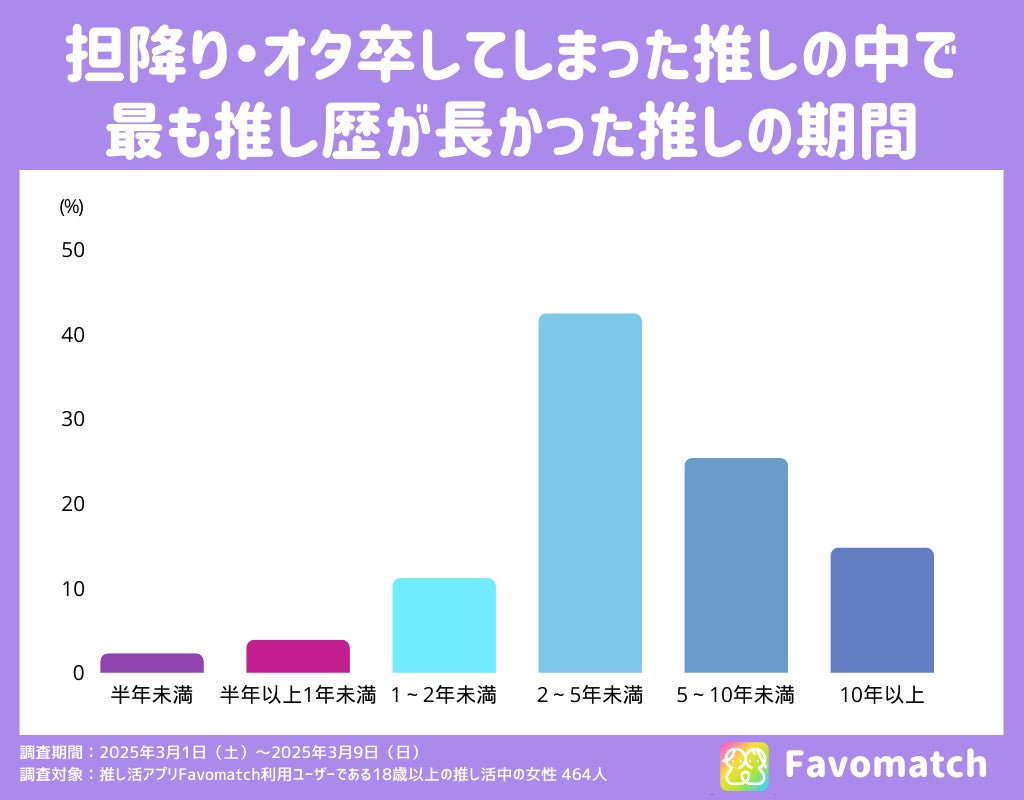 元推しの推し歴の最長期間で、最も多かったのは「2~5年未満」(42.5%)でした。