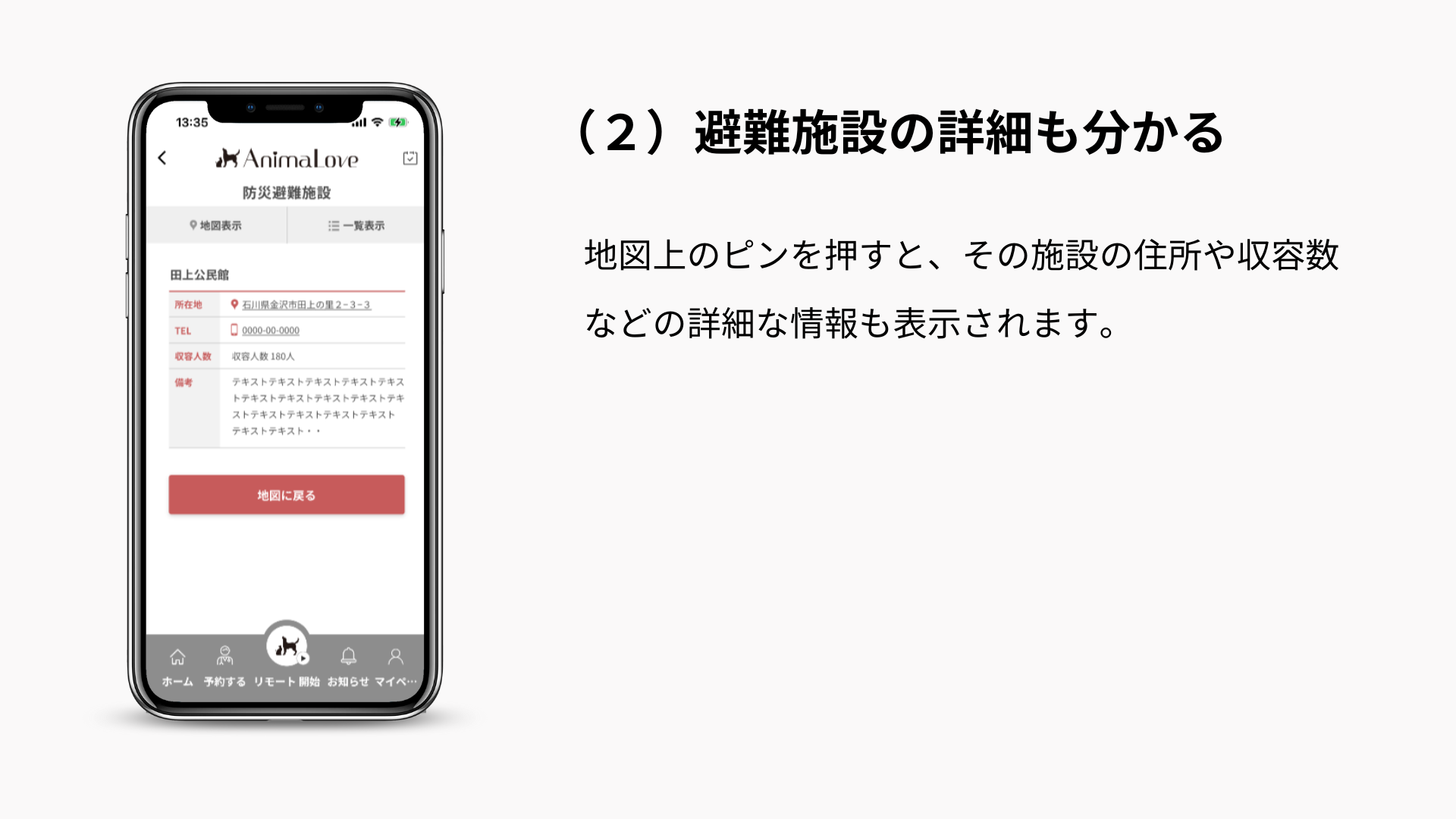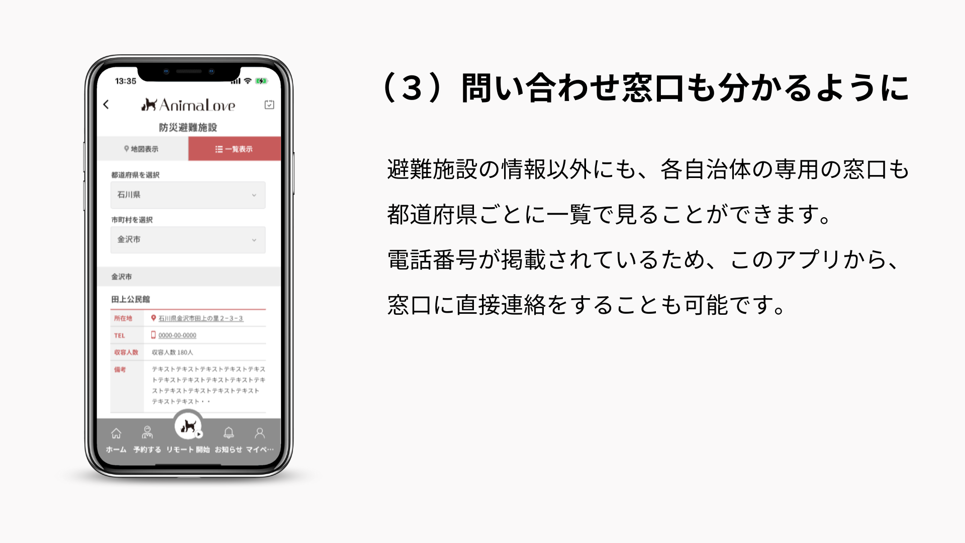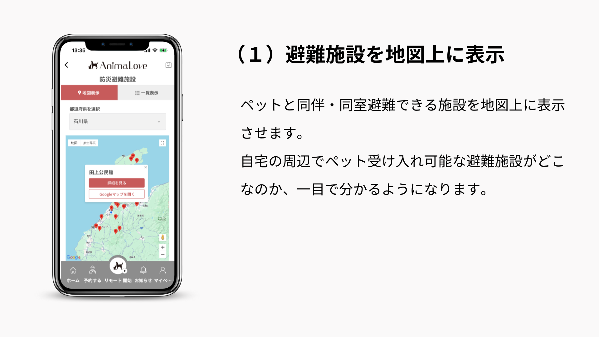 この結果を受けて、ペットと一緒に避難できる施設の情報を発信する必要があると思い、この度、クラウドファンディングのプロジェクトとしてアプリを開発することにいたしました。