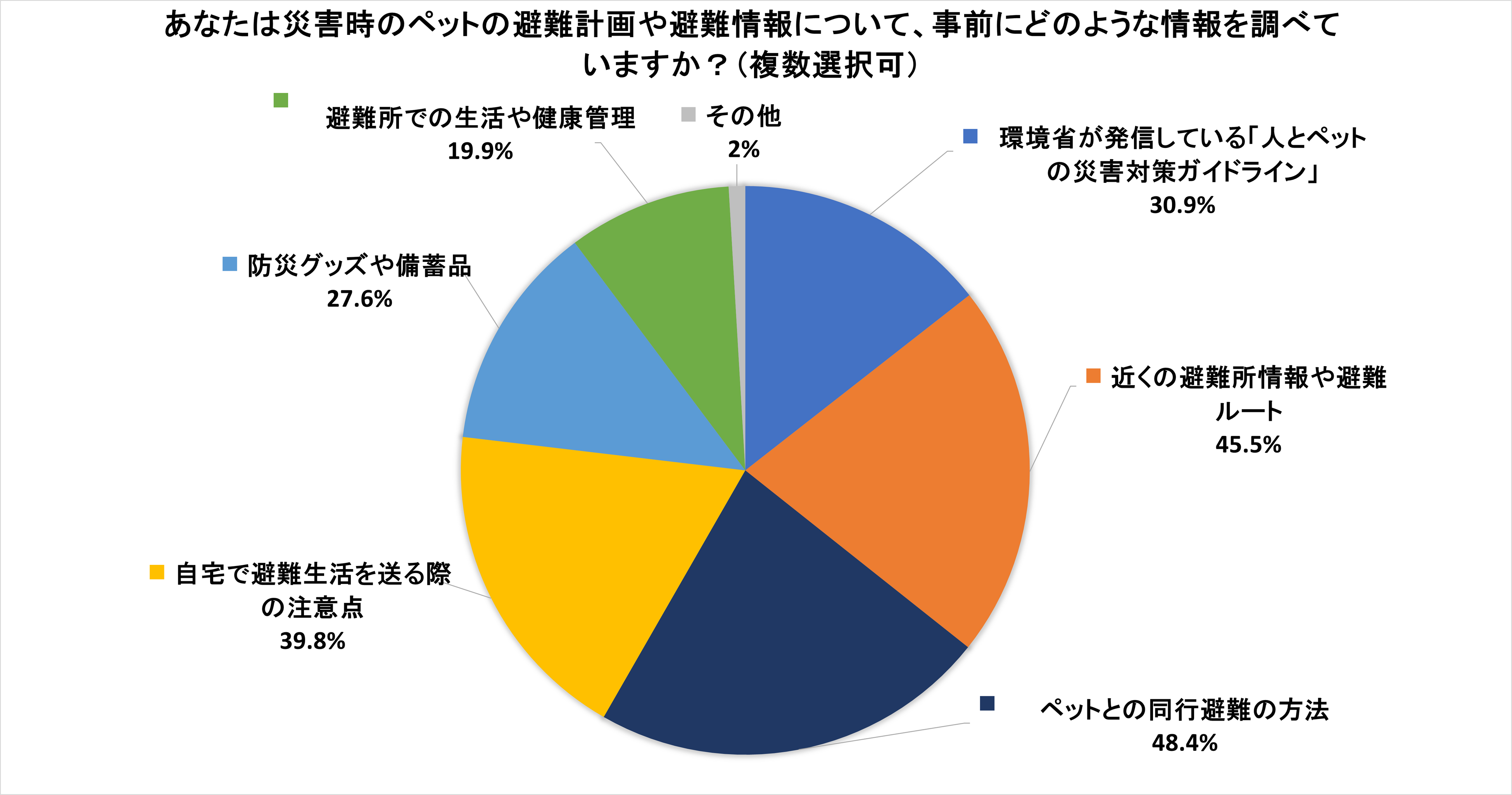 まず、災害時のペット避難などについて、飼い主が事前にどのような情報を集めているかたずねたところ、「ペットとの同行避難の方法」が48.8%と最も高く、次いで、「近くの避難所情報や避難ルート」が45.5%と、実際の避難行動に関する情報が多く調べられていることが分かりました。