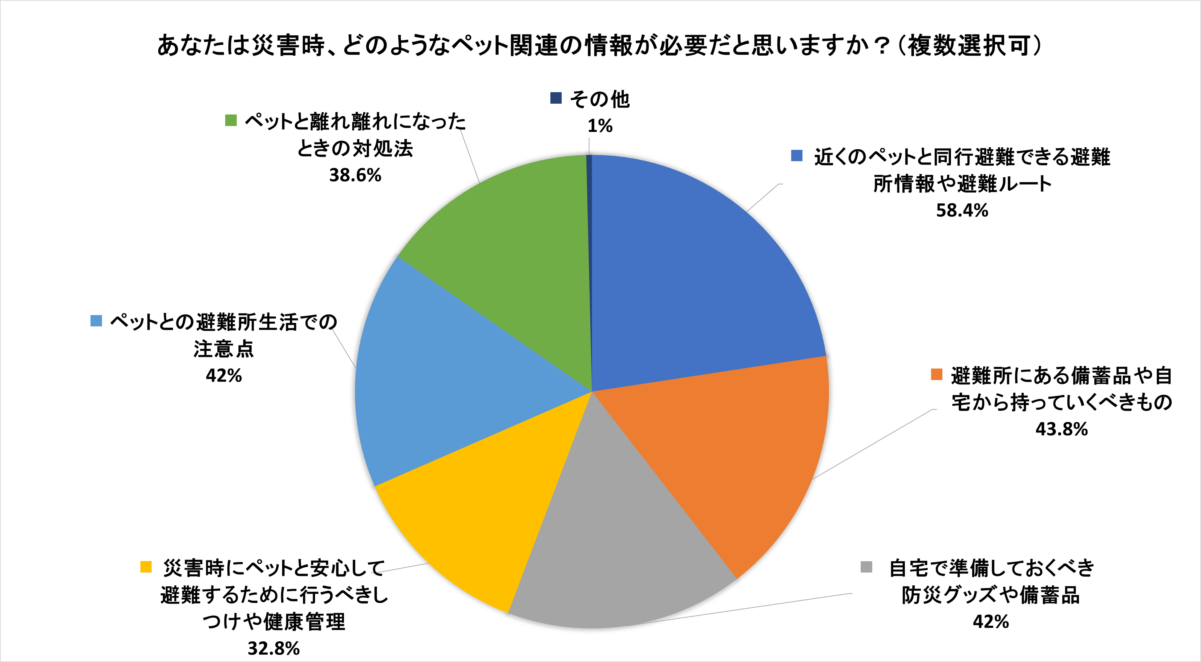 次に、災害時に必要なペット関連の情報は何かたずねたところ、「近くのペットと同行避難できる避難所情報や避難ルート」が58.4%と全体のおよそ6割を占めていて、次いで、「避難所にある備蓄品や自宅から持って行くべきものの情報」(43.8%)、「自宅で準備しておくべき防災グッズや備蓄品の情報」(42.0%)、「ペットとの避難生活での注意点」(42.0%)という結果でした。