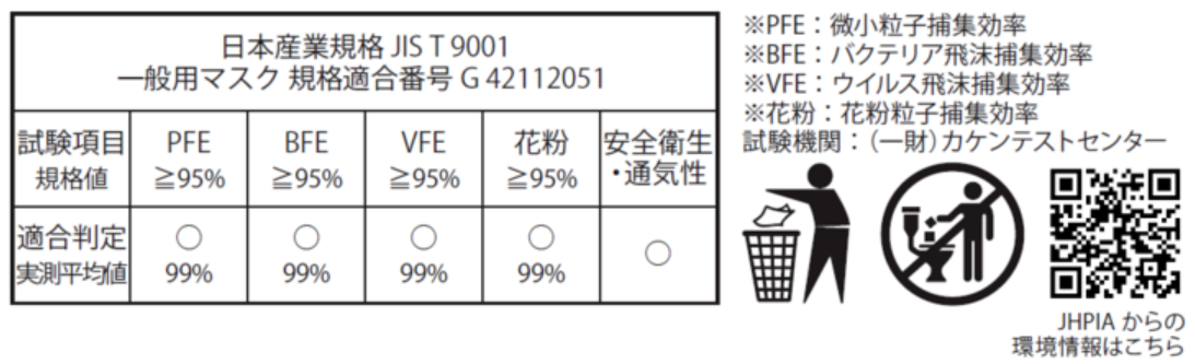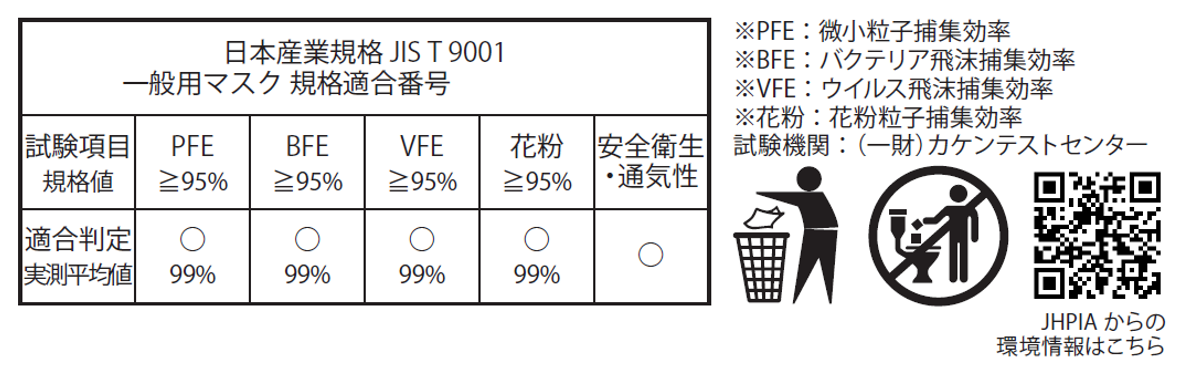 『フィルター性能』は、一般財団法人カケンテストセンターにて、バクテリア飛沫捕集(ろ過)効率、ウイルス飛沫捕集(ろ過)効率、花粉粒子捕集(ろ過)効率、微粒子捕集効率の全ての試験で99%以上の実績を証明しております。