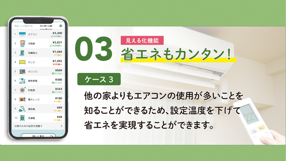 家電毎に電気料金がわかるだけでなく、類似世帯と比較し使用電力量の傾向を把握することができます。例えば、似た家庭と比較してエアコンの使用電力量が多いといったことがわかるため、設定温度を変更するなど省エネに資する具体的な行動に気付くことができます。