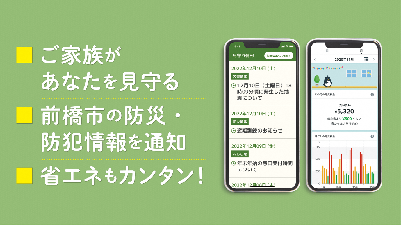 ご家庭に電力センサーを1つ設置するだけで、「家電毎の電力使用量の見える化を通じた見守り」、「自治体からの防災・防犯情報をプッシュ型で通知」するアプリサービスを提供します。