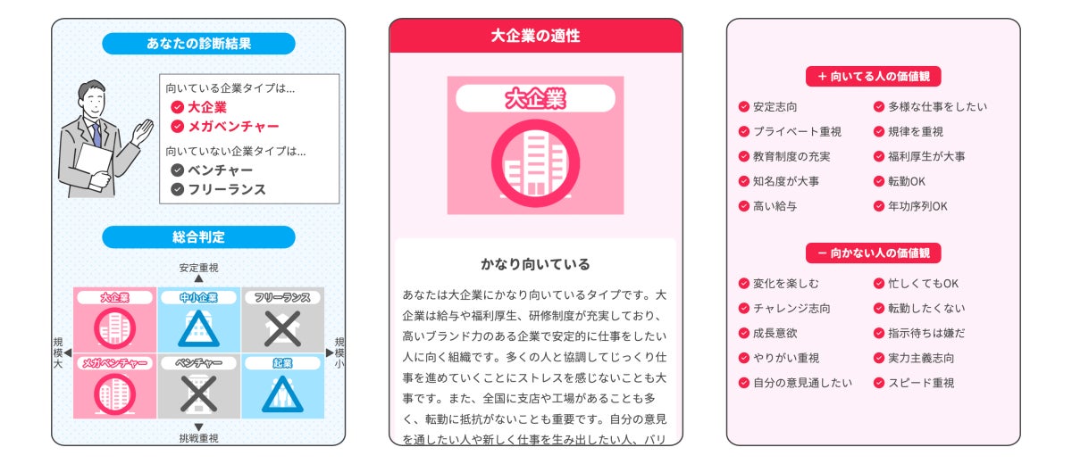 大企業に向く価値観、向かない価値観など、企業タイプごとにどんな価値観を持っていると適性があるか知ることができます。自分が希望している企業のタイプが本当に自分の性格や価値観と合っているのか確認することで、就活や転職時にギャップが生まれることを避けることができます。