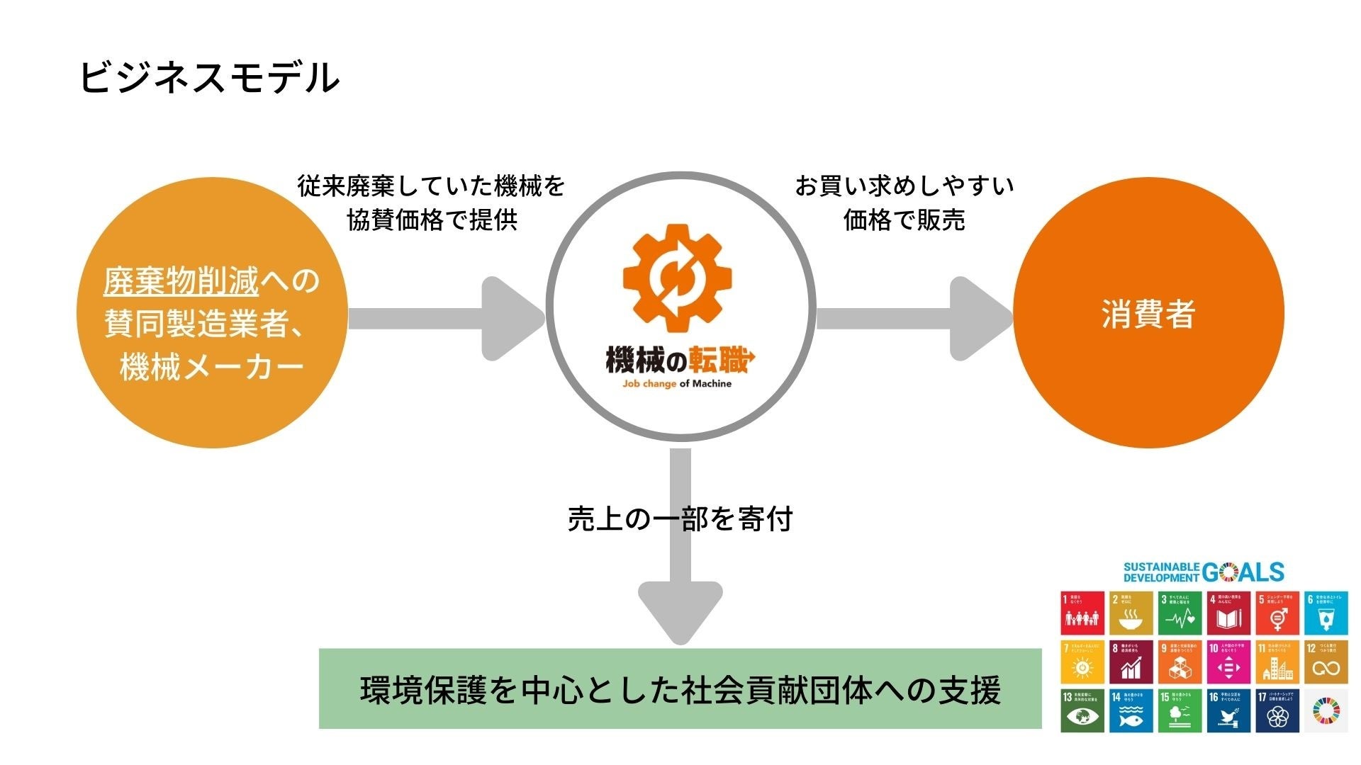 それらの機械を中古市場に流通させるためにUTTEに買取を依頼すれば、その企業は環境保護に貢献をしているといったイメージアップにもつながる仕組みが必要と考え、売上の一部を環境保護を中心とした社会貢献団体へ寄付を行うビジネスモデルに変換します。