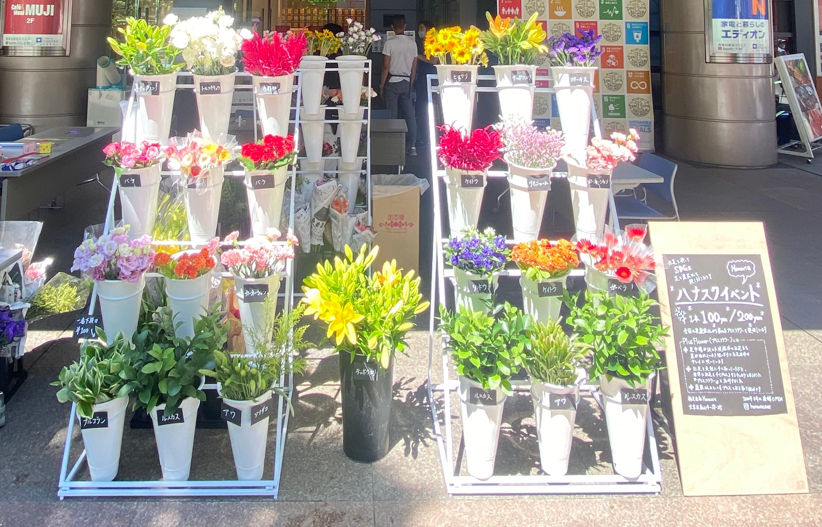 規格外の花「プラスフラワー※」を活用した取り組みを主に異業種の外部事業者とともに行なっています。例えば、カフェや製菓店などの店頭でプラスフラワーを1本100円・200円で販売する「ハナスク」(=お花を飾って、花(ハナ)と農家さんを救(スク)おう!)です。環境問題を喚起するイベントでの装飾などでも活用します。花の廃棄ロスを減らして花農家さんの支援にも繋げ、プラスの循環を生み出す。より多くの人の日々の癒しに、大切な人とのコミュニケーションに、気づけば花が寄り添う未来を目指しています。