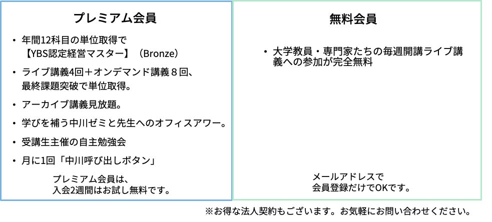 先行して実施した大学教員によるライブ講義を毎週受講できる無料会員サービスと併せて【「アカデミーの力を、社会に」誰一人取り残すことなく、この社会を上手に歩いていくための基礎的知識として経営学を社会基盤としてインストールする】という目標の達成に大きく前進することを確信しています。