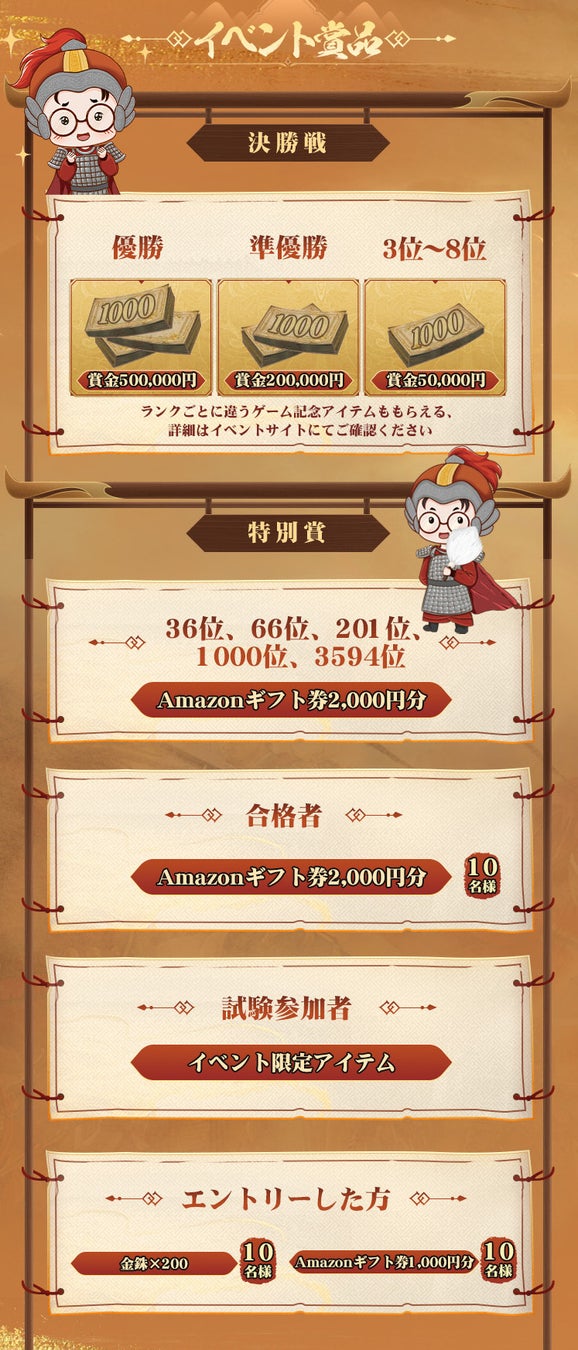 ※決勝進出者8名は、東京で行われる三国志最強頭脳NO.1を決める決勝戦の生放送会場にご招待いたします。 万が一ご参加いただけない場合、資格及び賞品は次の順位の方に譲渡されます。予めご了承くださいませ。
