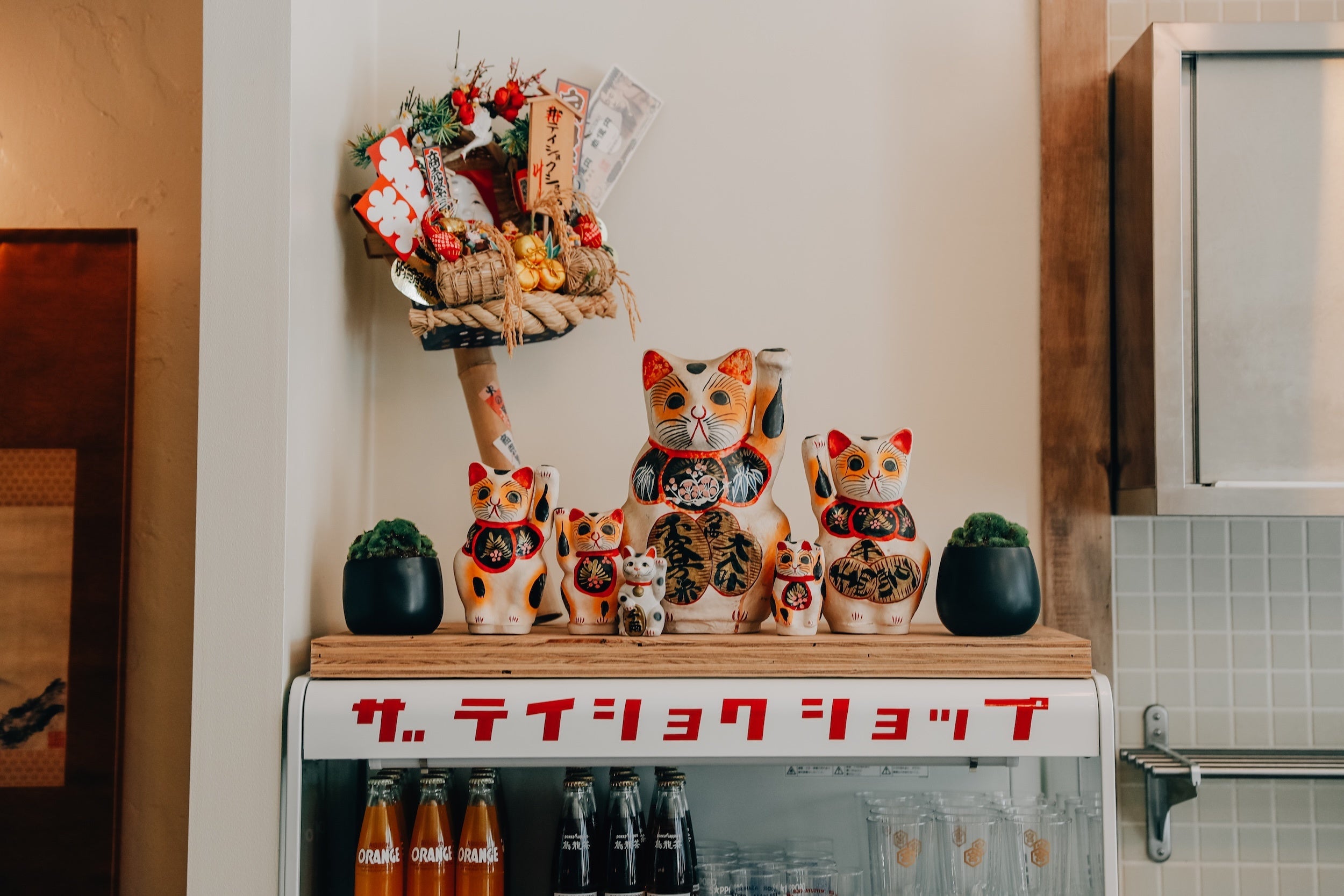 壁には、江⼾時代にお寺に飾られていた欄間や和紙で制作された⼤きな鯉のぼりをオブジェとしてディスプレイ。他にも幕末三筆の貫名菘翁(海屋)による富⼠⼭の水墨画が描かれた掛け軸や書道家の中友香による書き下ろしの書も。