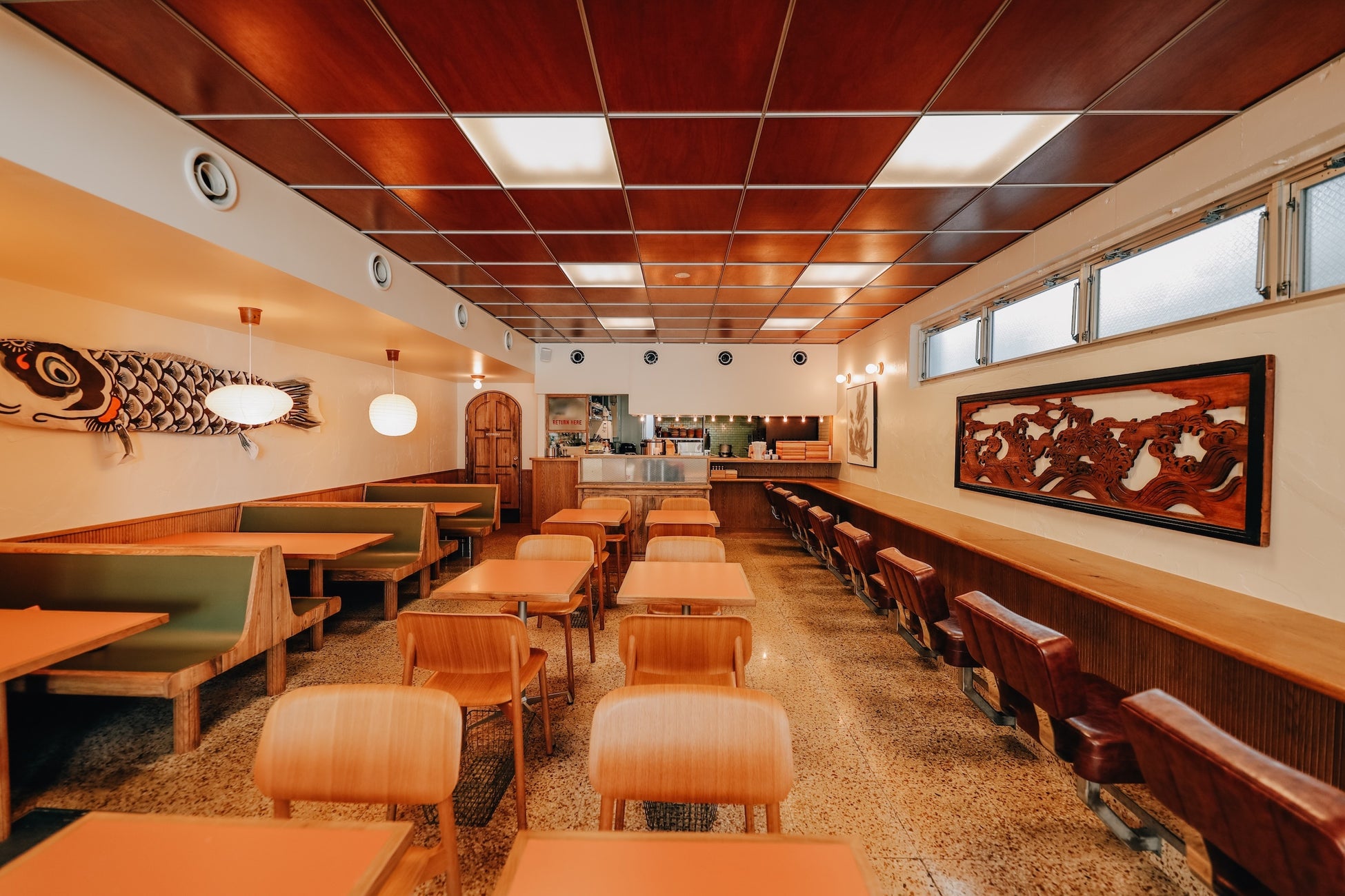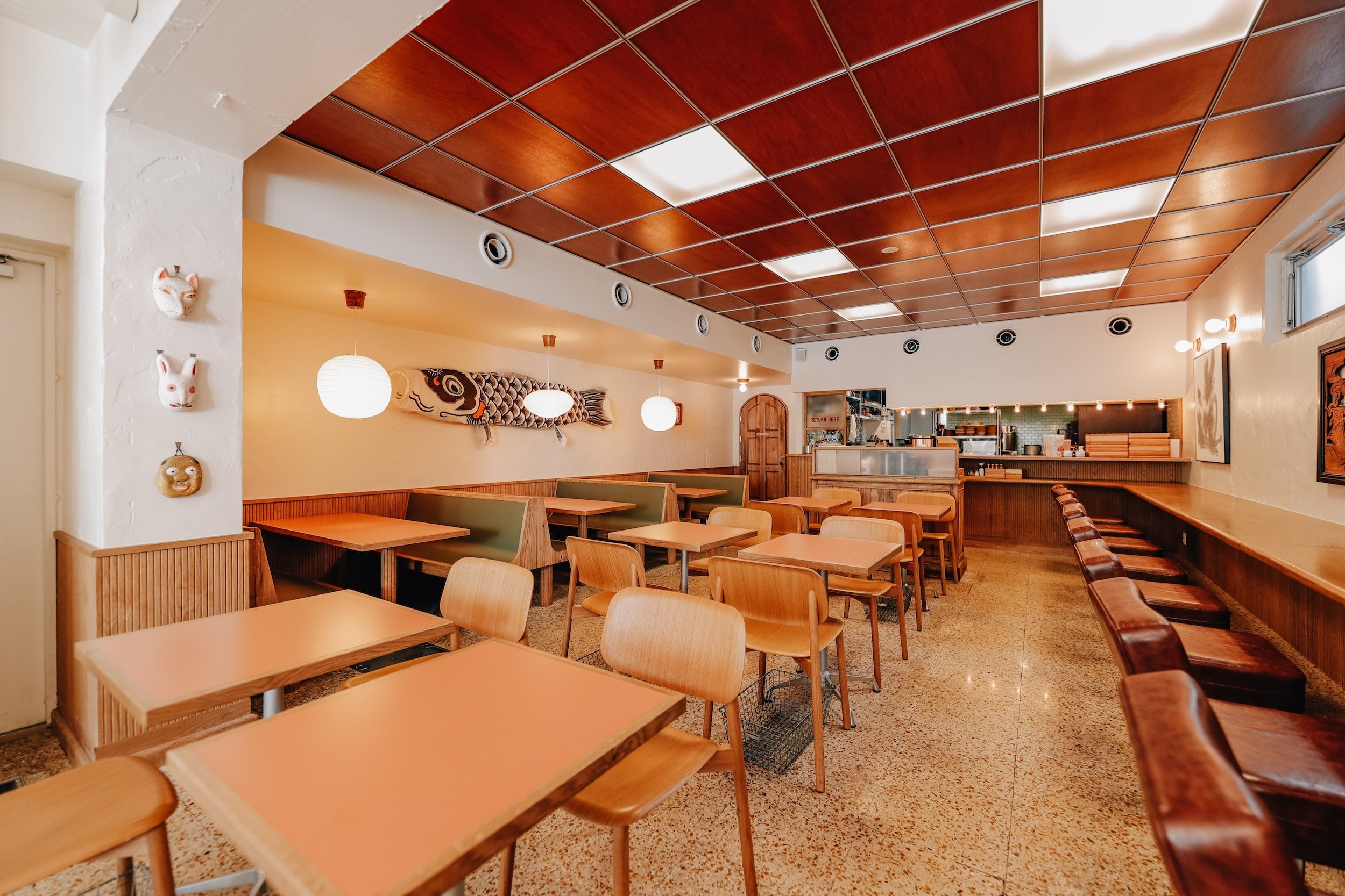 日本とアメリカ、それぞれのミッドセンチュリーデザインが調和する空間には、和を感じさせるモスグリーンと燻んだオレンジの松皮色のテーブルを配置。ミッドセンチュリーを象徴するイサム・ノグチの照明がやさしく店内を照らします。